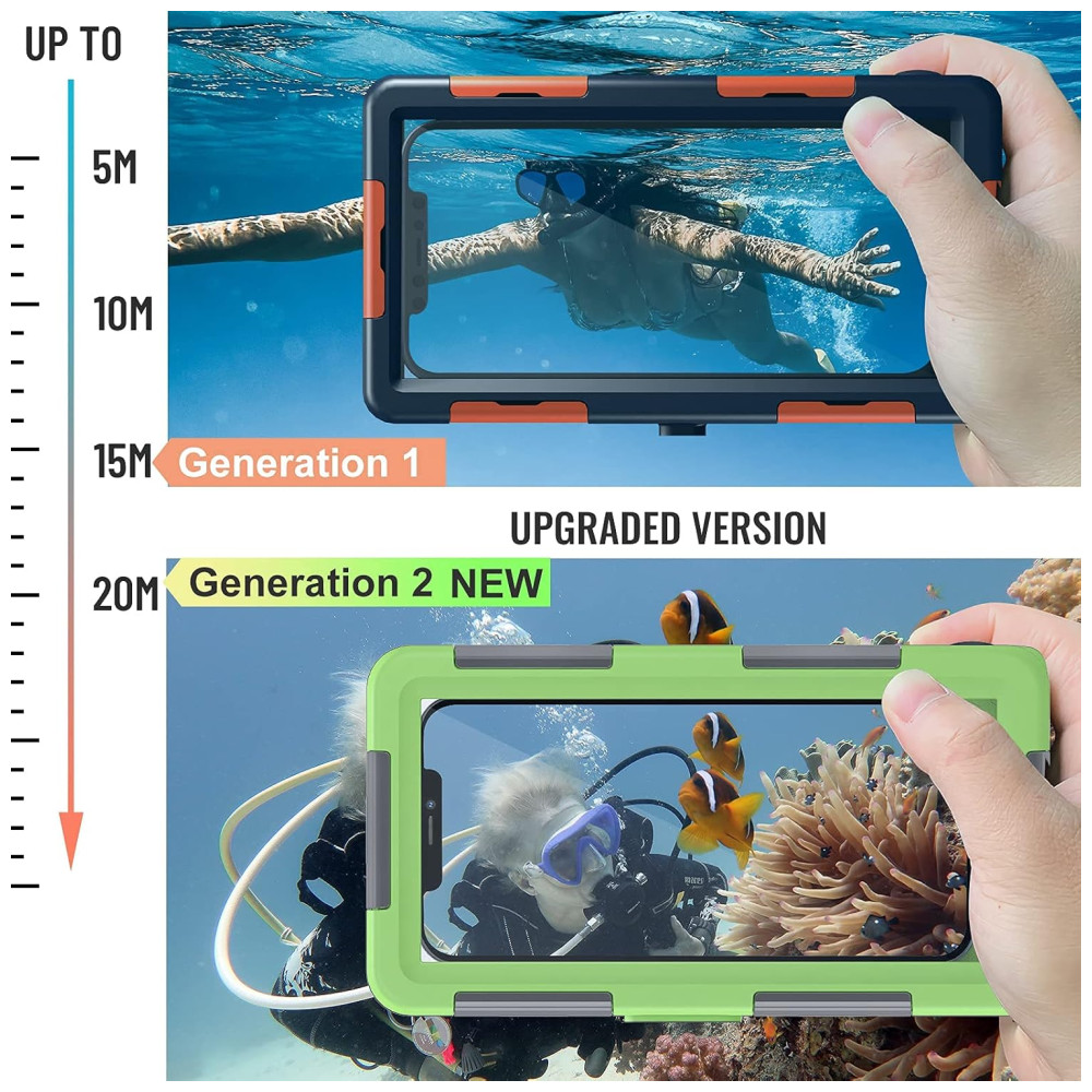Profundidade máxima de mergulho de 66 pés , 20 M atualizada Usamos materiais resistentes à prova dágua e pressão de água IP68 de alta qualidade para atualizar a profundidade máxima de mergulho do estojo de mergulho de 15 M , 50 pés para 20 M , 66 pés, o que melhora muito a resistência à prova dágua e à pressão da concha de mergulho. Se você e sua família ou amigos são entusiastas do ar livre que gostam de esportes aquáticos ou subaquáticos, esta concha de mergulho atualizada definitivamente se tornará seu melhor parceiro para viagens ou férias.