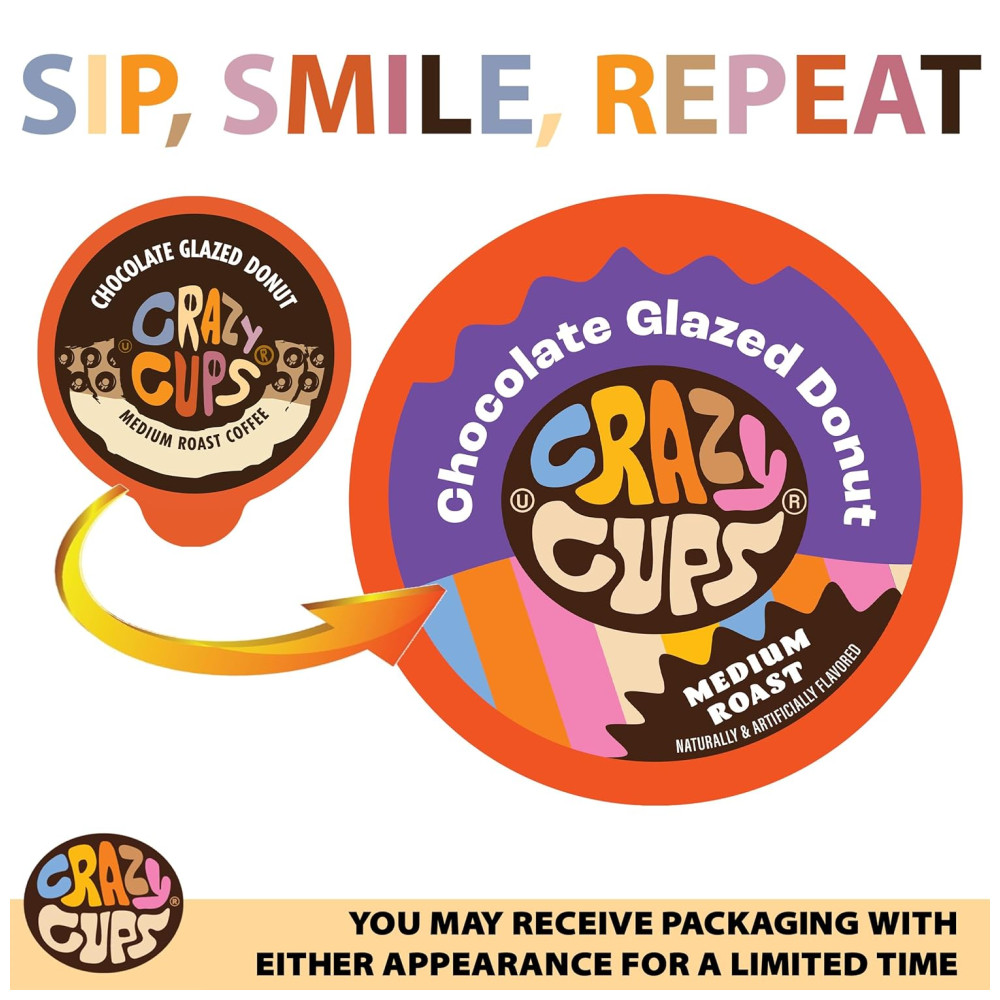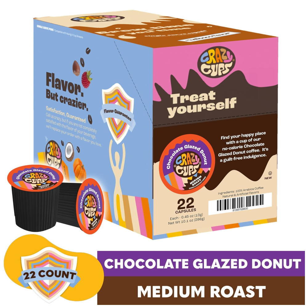 Crazy Cups para máquinas Keurig K Cup, Sabor Rosquinha de Chocolate, bebidas quentes ou geladas, 22 doses individuais, cápsulas recicláveis