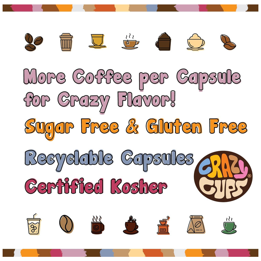 COMPATIBILIDADE E VERSÁTIL Todos os cafés Crazy Cups Artisan Roasted Single serve são compatíveis com as máquinas de café Keurig K Cup 1.0 e 2.0. Prepare rapidamente qualquer um de nossos cafés com sabor, como trufa de framboesa de chocolate, especiarias descafeinadas ou morte por chocolate. Prometendo sabor e sabor incomparáveis, nossas cápsulas de café são preparadas com os Keurig K Cups Brewers. Keurig e K Cups são marcas registradas da Green Mountain e Keurig. Crazy Cups não tem afiliação com Keurig