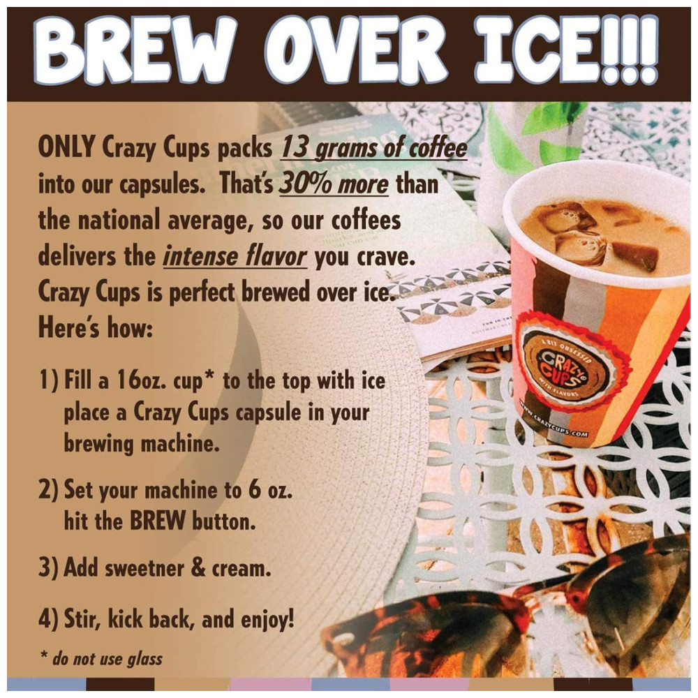 O pacote de variedade de café com sabor dos amantes de chocolate da Crazy Cups contém Morte por chocolate, xícara de manteiga de amendoim, trufa de framboesa de chocolate, tartaruga mocha, sonho de coco com chocolate, mocha com chocolate e menta. 13 gramas de café, 35 a mais de café do que outros k cups Os Crazy Cups são bons para o meio ambiente com copos recicláveis Use a tecnologia cool peel recycle Sem glúten, com certificação kosher, sem lactose, vegan e pareve Para uso com ALl Keurig K cup Incluindo o Keurig 2.0