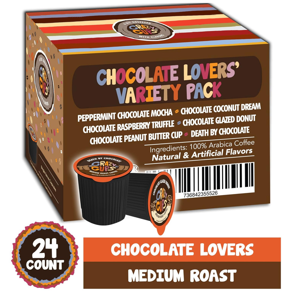 Crazy Cups Pacote de variedade de capsulas de café para amantes de chocolate, cafés com sabor de chocolate, compatível com K Cup, inclui os sabores Morte por chocolate, framboesa de chocolate, mocha de hortelã pimenta, etc.