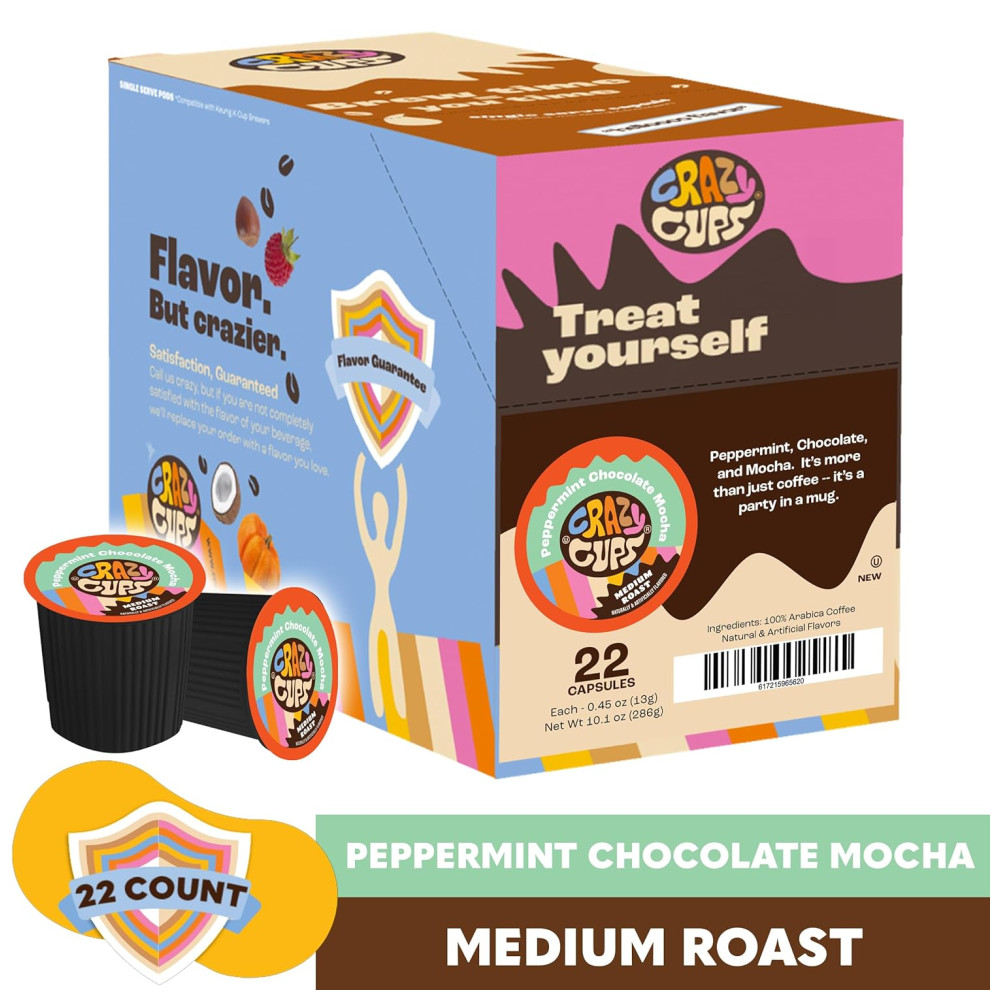 Crazy Cups café com sabor para máquinas Keurig K Cup, Mocha de chocolate com menta, bebidas quentes ou geladas, 80 doses individuais, cápsulas recicláveis
