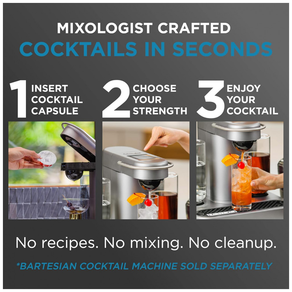 Nossas cápsulas de coquetel pré misturadas são projetadas para funcionar perfeitamente com a máquina de fazer coquetéis Bartesian de última geração vendida separadamente, para que você possa desfrutar de uma bebida deliciosa e satisfatória em apenas alguns segundos. Então, se você está entretendo convidados ou simplesmente relaxando depois de um longo dia, Bartesian é a maneira perfeita de elevar sua experiência de coquetel em casa.
