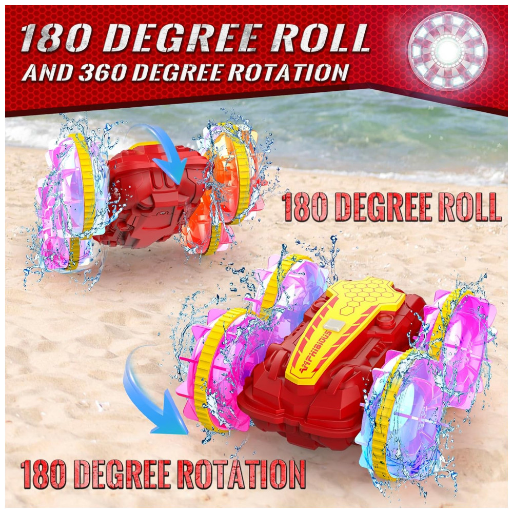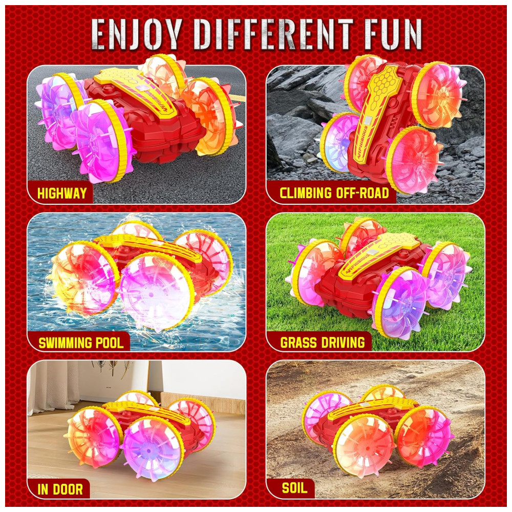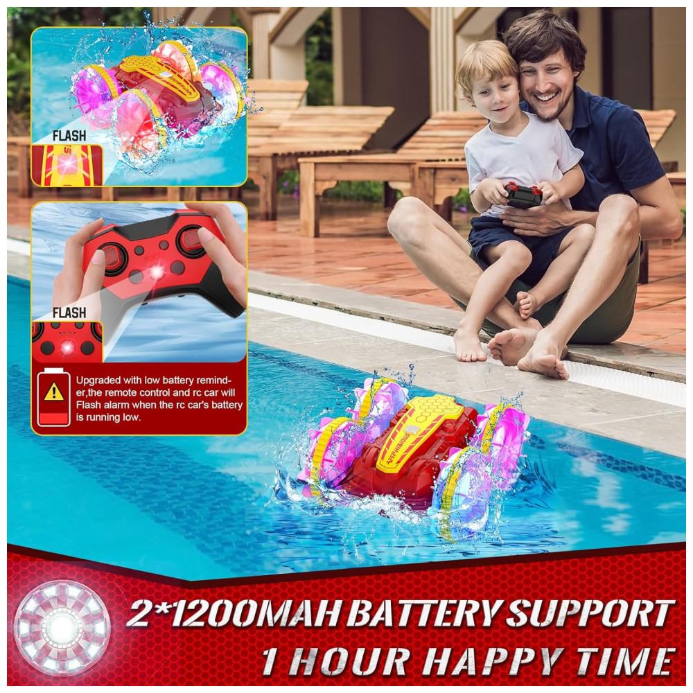 O Carro de Controle Remoto Anfíbio à Prova d’Água é uma incrível opção de diversão para crianças! Totalmente à prova d’água, ele pode não apenas correr em terra, mas também nadar na água. Com design preciso à prova d’água, à prova de vento e à prova de chuva, ele pode desafiar e conquistar qualquer ambiente extremo. As luzes coloridas nas rodas transparentes proporcionam efeitos deslumbrantes. Além de avançar, retroceder, virar para a esquerda e direita, este carro anfíbio pode realizar acrobacias como rotação de 360 graus, círculo e dirigir de ambos os lados. Conquiste facilmente terra, praia, lama, grama e água, proporcionando às crianças uma experiência realista de direção. Inclui controle remoto e controle manual por sensor de gestos. Duas baterias recarregáveis oferecem horas de diversão contínua. Um presente incrível para crianças aventureiras de 6 a 12 anos!