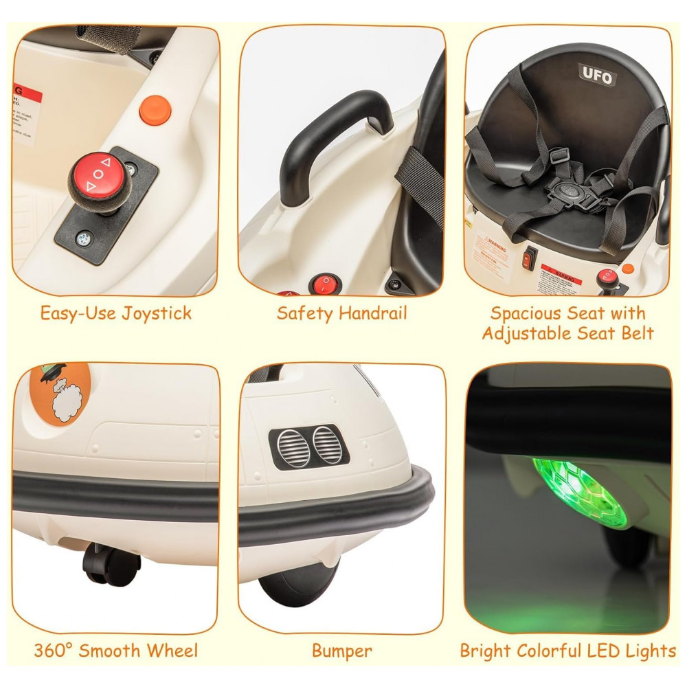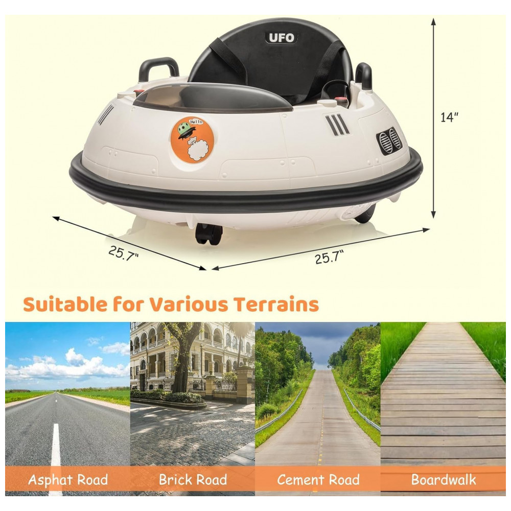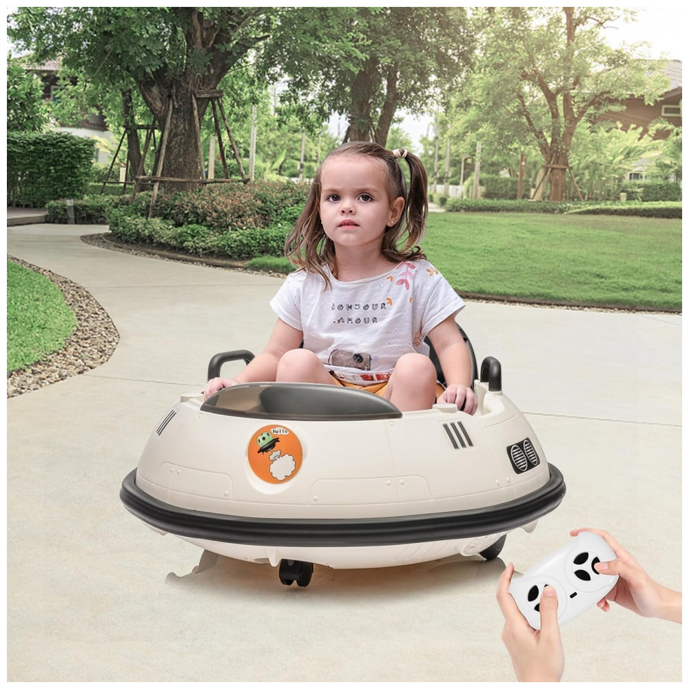 Carrinho bate-bate elétrico infantil 12V PALBY’S na cor branca, desenvolvido para crianças a partir de 18 meses, com estrutura circular, cinto de segurança e faixa de proteção macia ao redor da base para absorver impactos leves durante a brincadeira. As rodas com capacidade de giro de 360 graus permitem manobras em todas as direções em superfícies internas lisas, com função de partida lenta para maior conforto e controle.