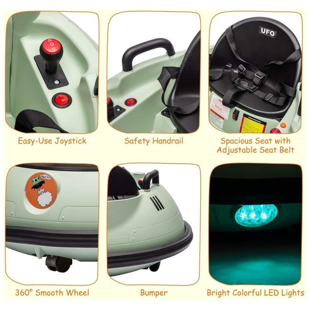 O brinquedo oferece comandos por dois joysticks integrados ao assento para uso pela criança e controle remoto 2,4G para operação pelos responsáveis, aumentando o controle em crianças menores. Recursos adicionais incluem iluminação LED e reprodução de músicas, criando um ambiente visual e sonoro lúdico durante o uso.