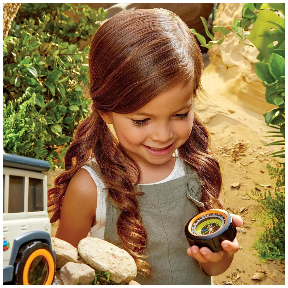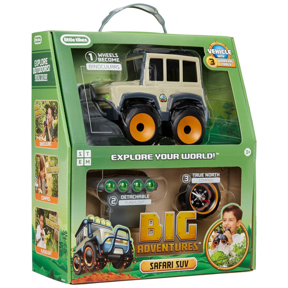VEÍCULOS ROBUSTOS, EQUIPAMENTOS DE VERDADE Os brinquedos Big Adventures combinam brincadeira, diversão e aprendizado com ferramentas reais relacionadas a STEM. Este caminhão SUV Safari inclui três ferramentas destacáveis binóculos, lanterna e bússola.