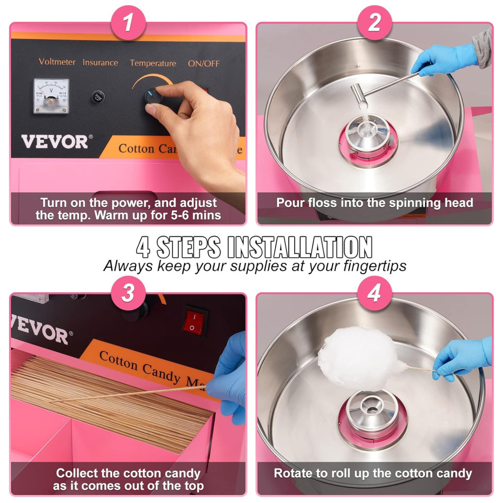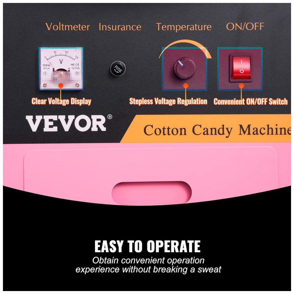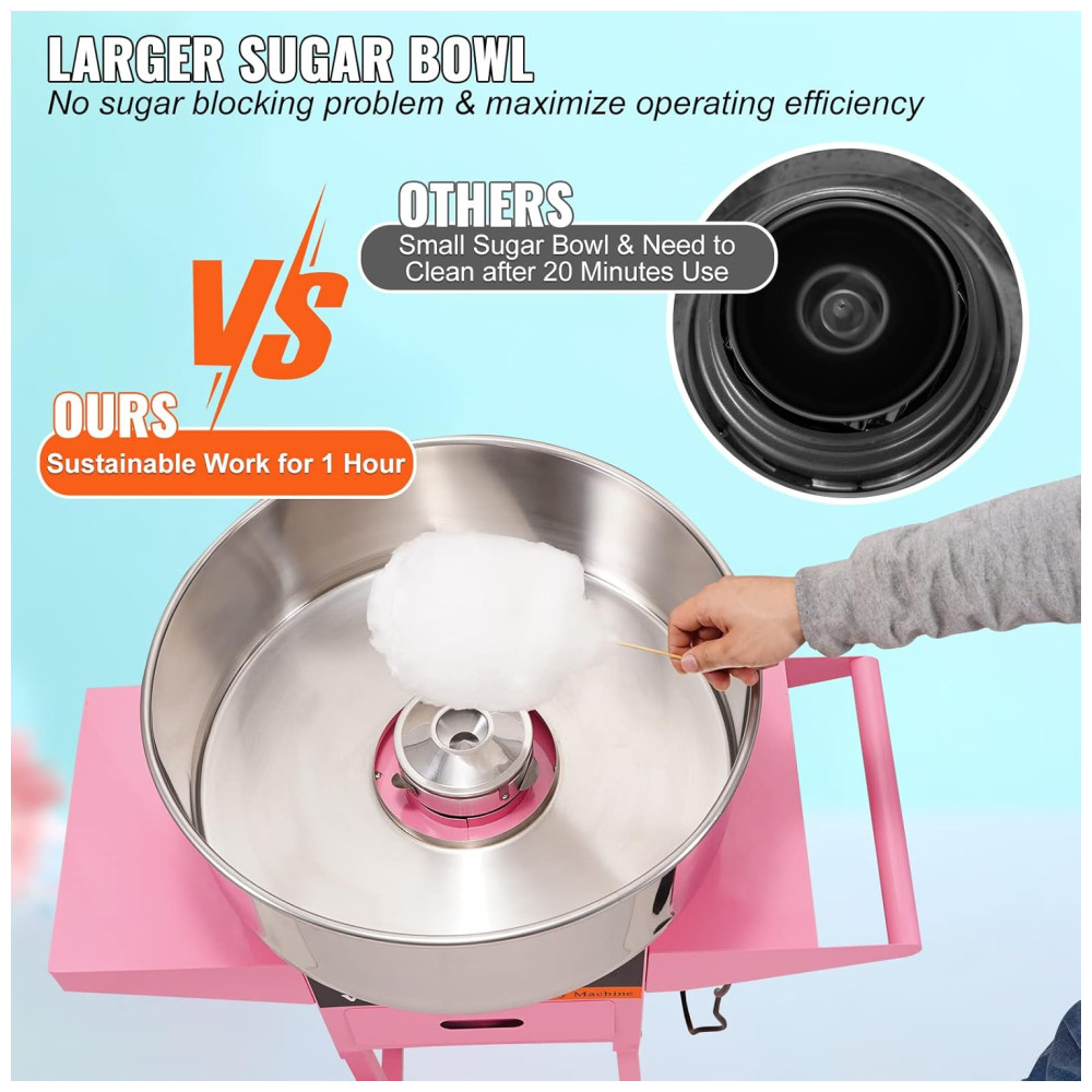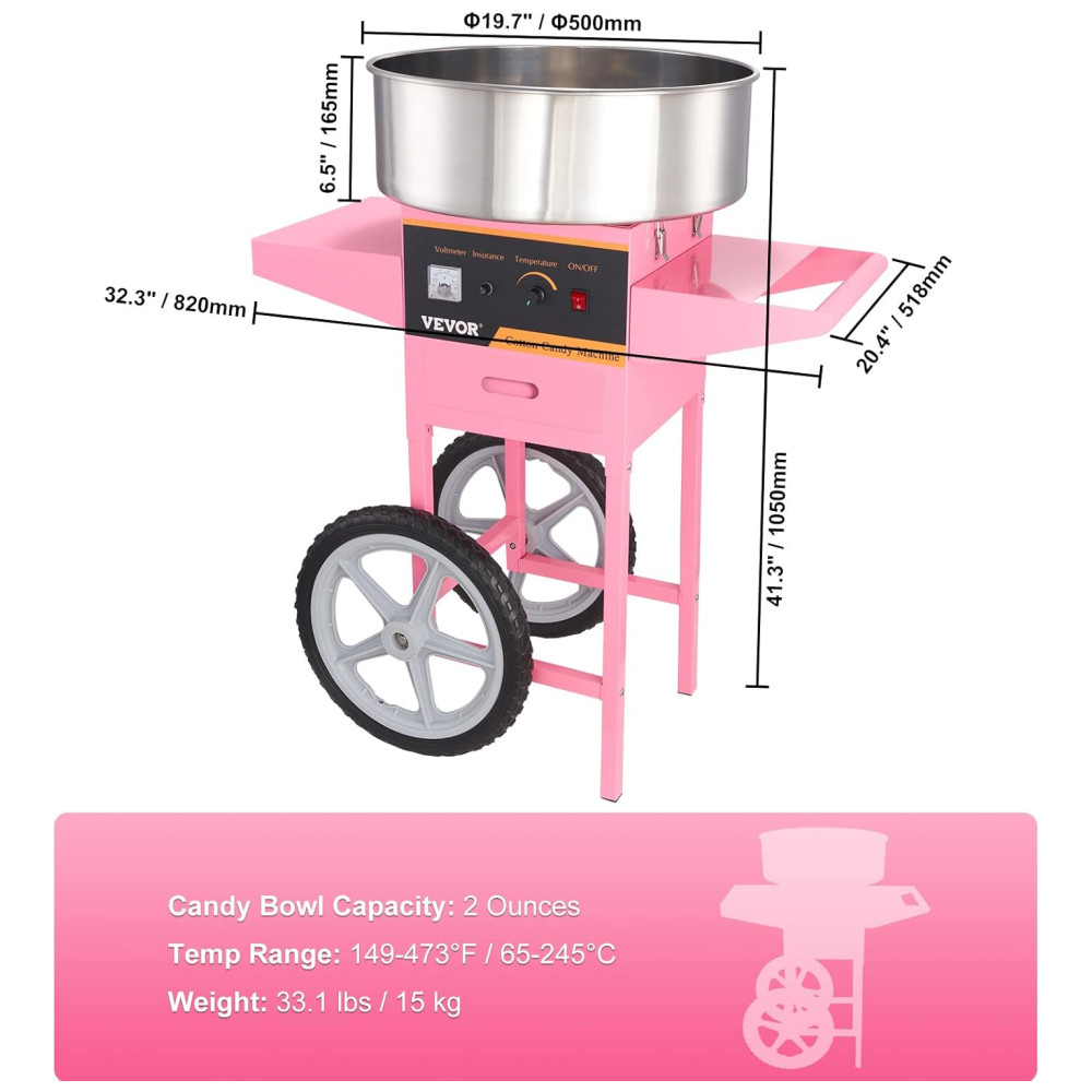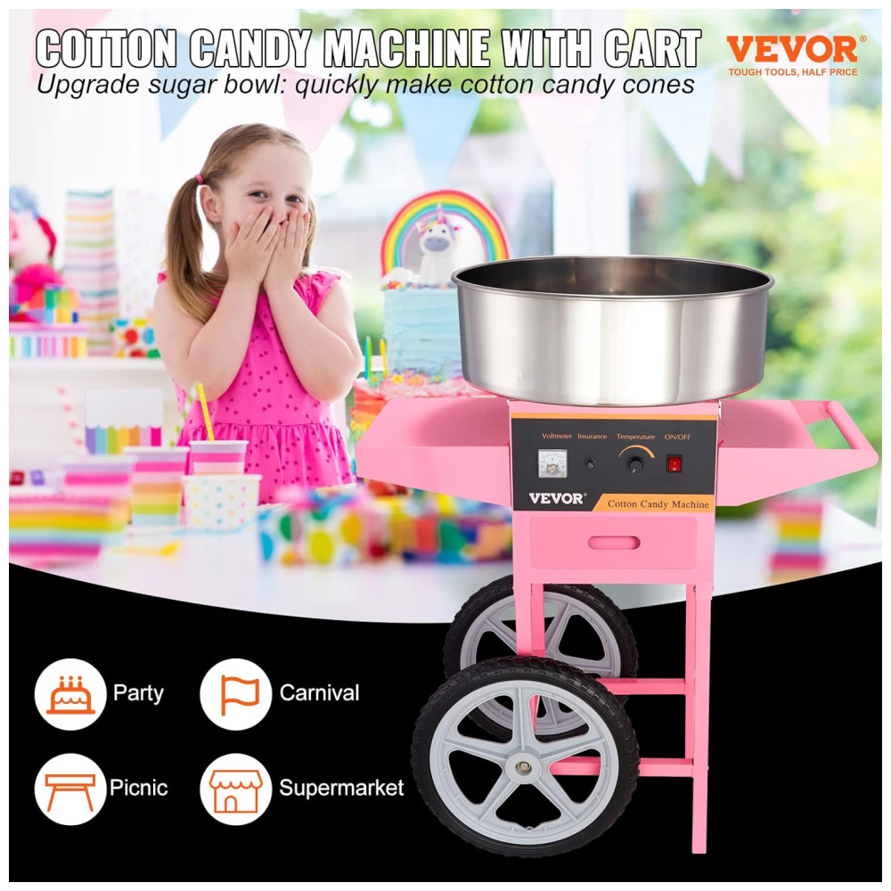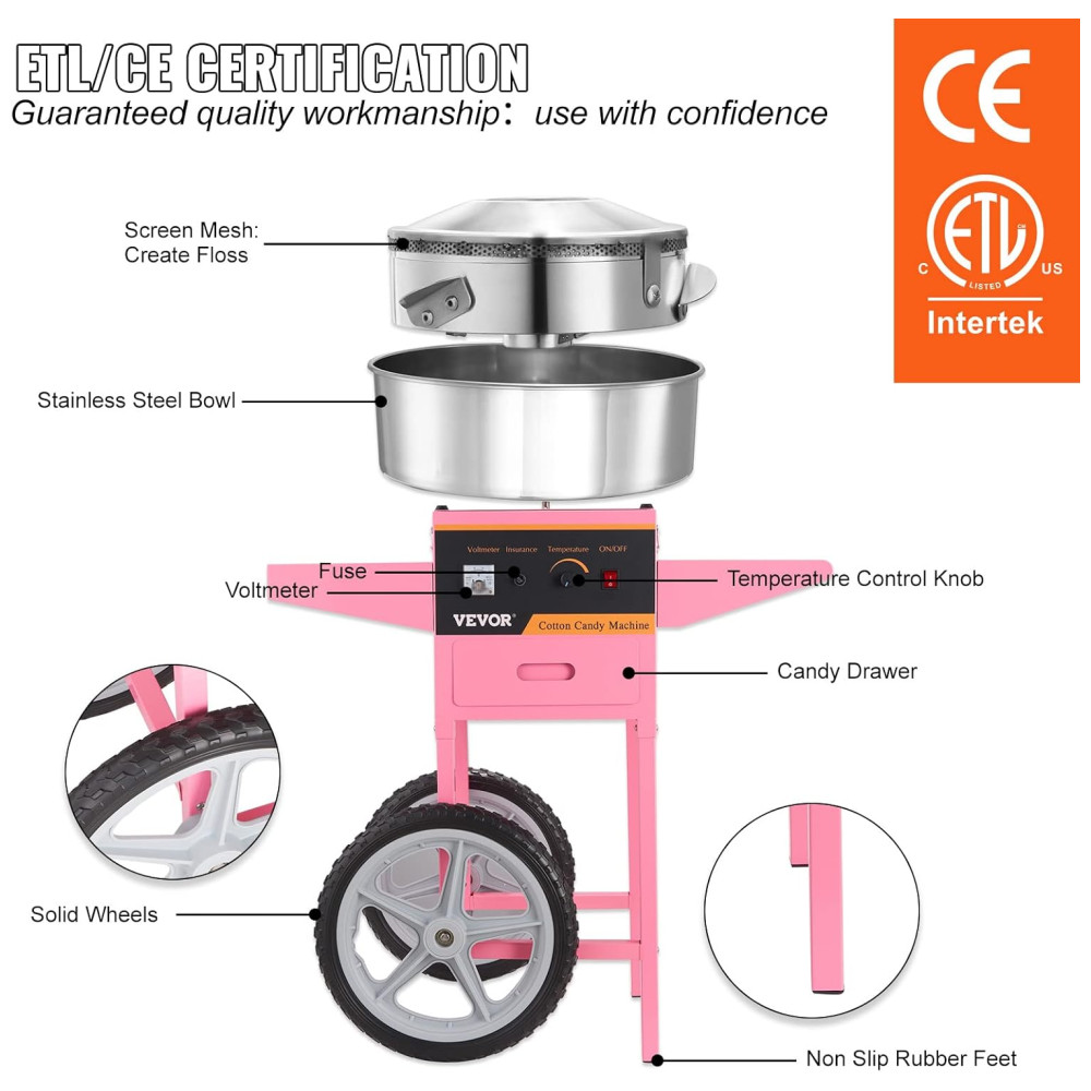 Carrinho de Algodão Doce Elétrico Profissional em Aço Inoxidável 110V 1000W VBENLEM Rosa