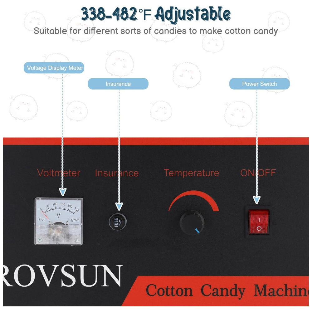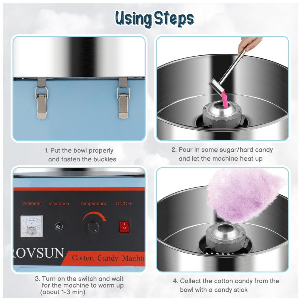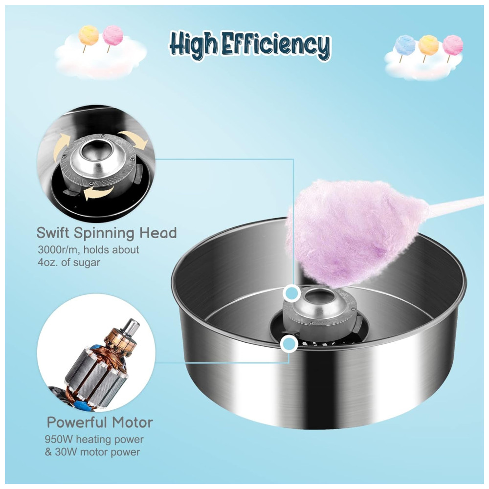 Alta eficiência Equipado com potência de aquecimento de 950W e potência do motor de 30W, nossos fabricantes de algodão doce levam apenas alguns minutos para aquecer e produzir até 2 3 porções por minuto. A cabeça giratória rápida pode conter. de açúcar, o que evita enchimentos repetidos e torna o processo eficiente