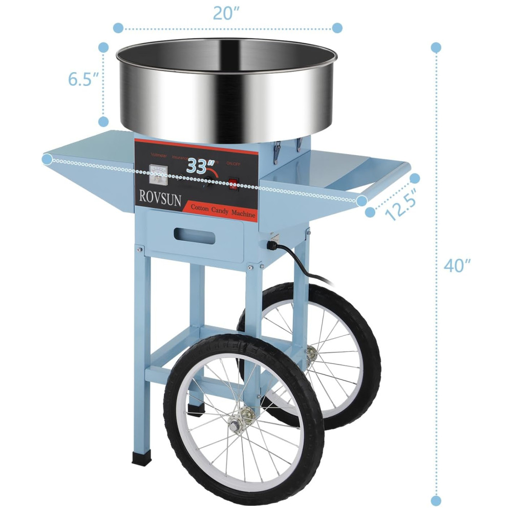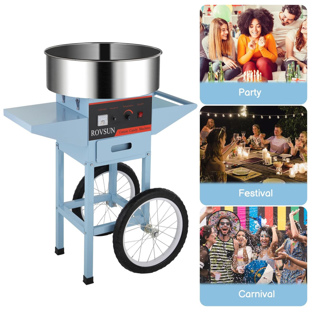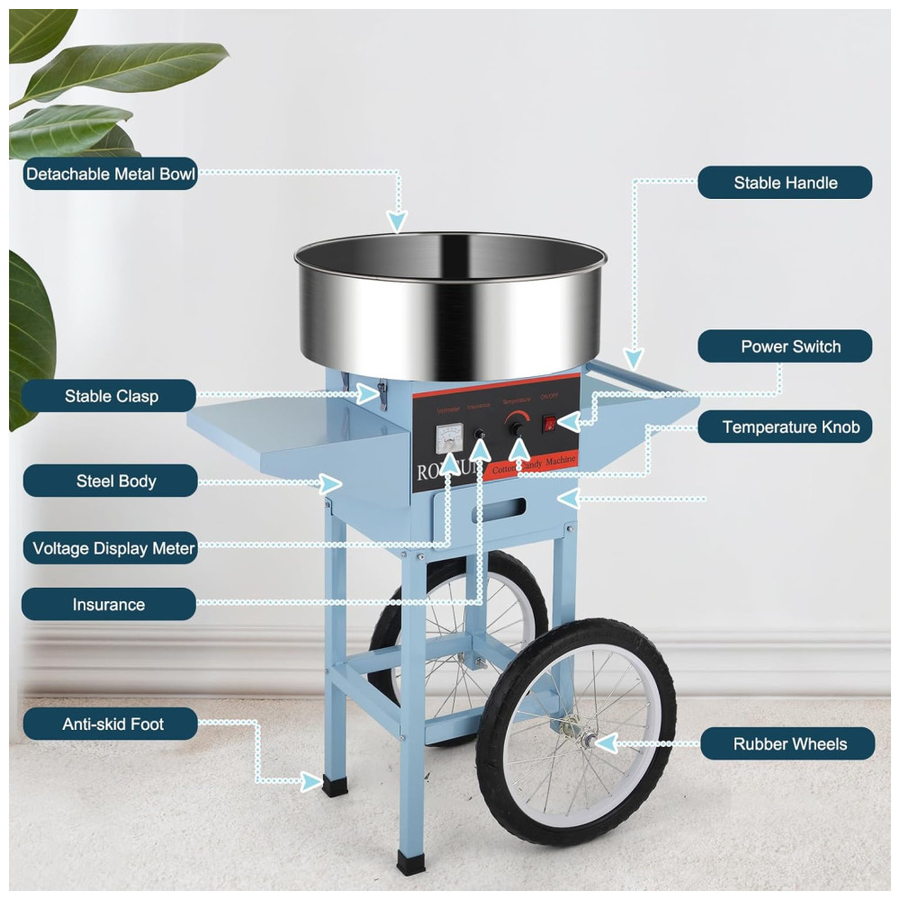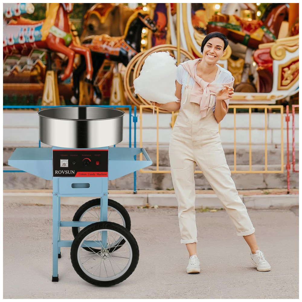 Carrinho de Algodão Doce Elétrico Profissional em Aço Inoxidável 110V 950W ROVSUN Azul Claro