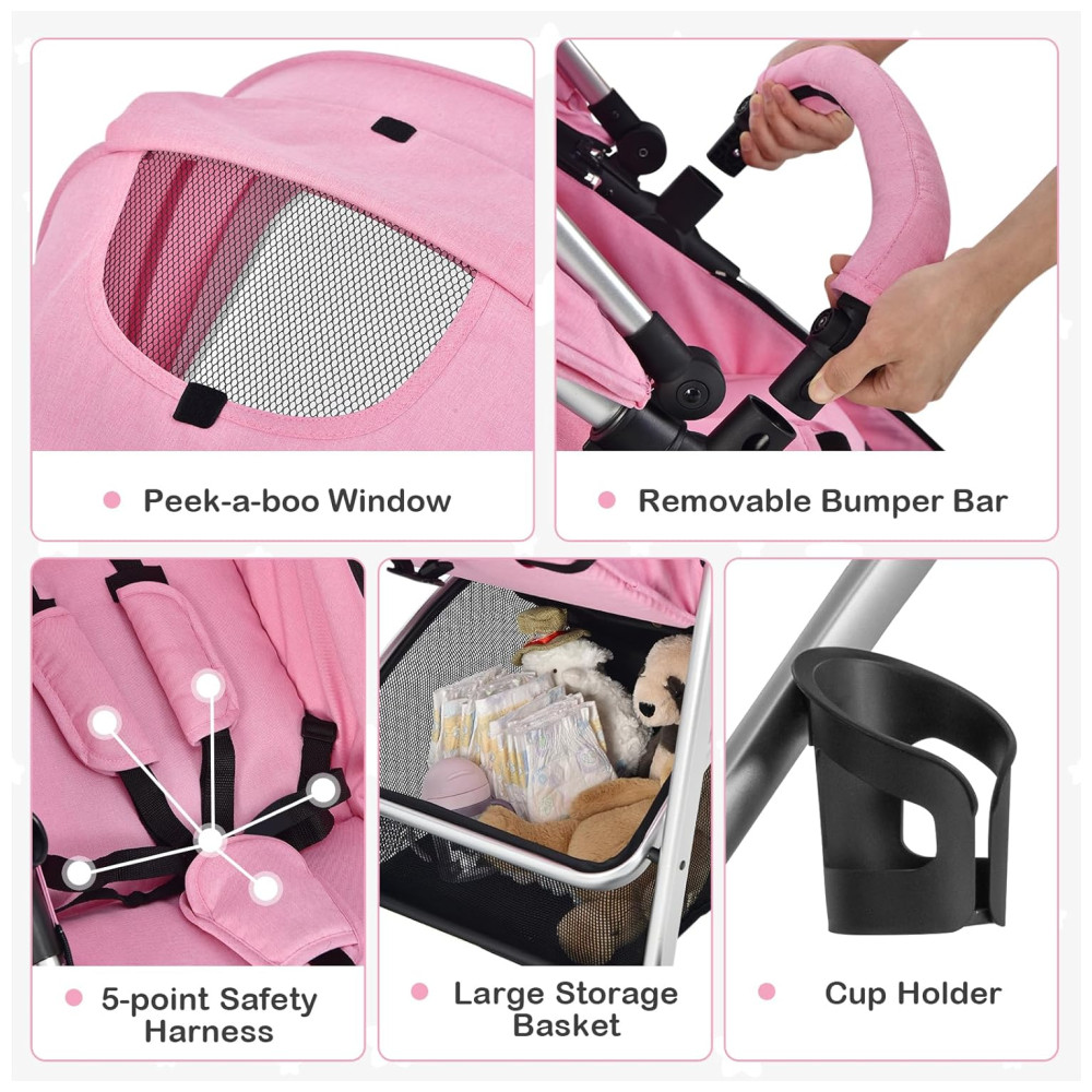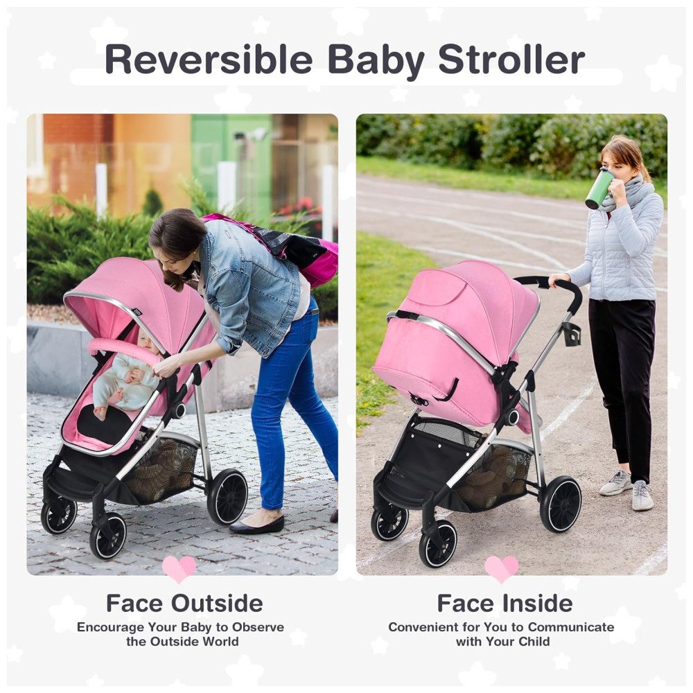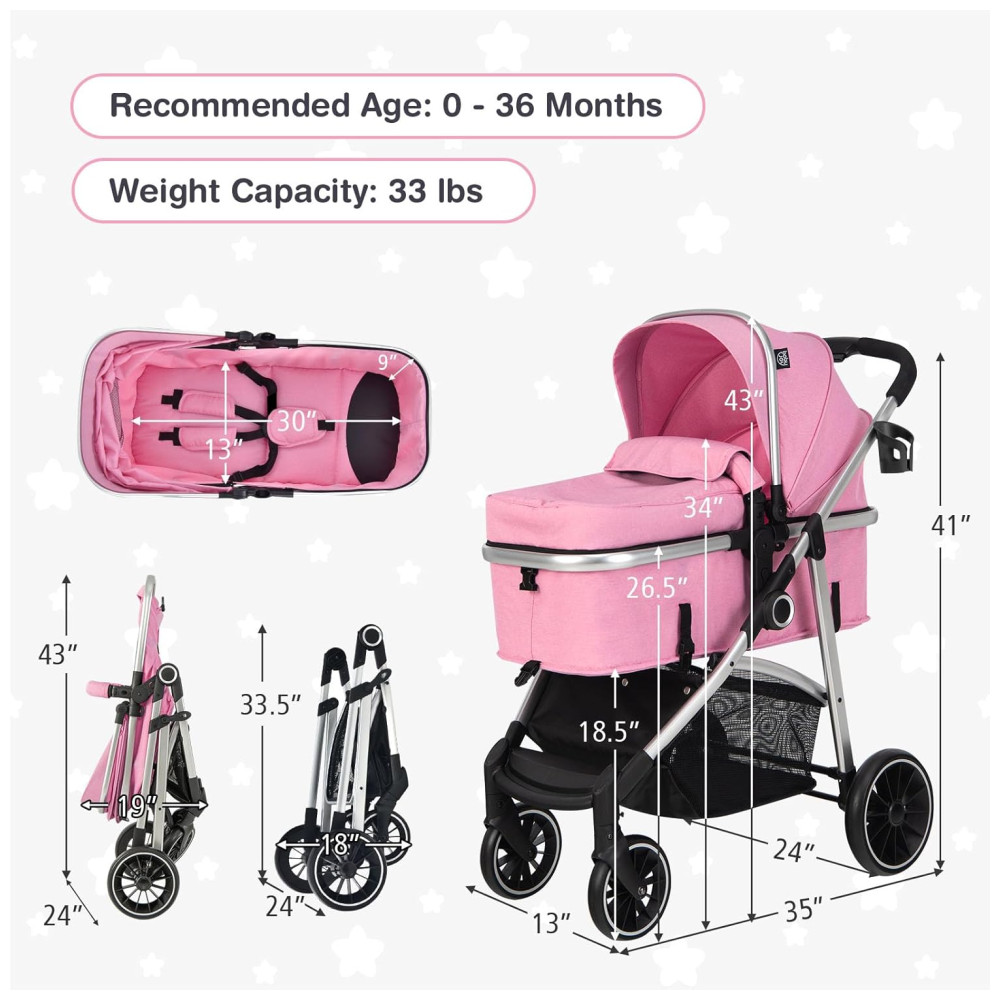 Carrinho de Bebê 2 em 1 com Assento Reversível e Encosto Ajustável 0 a 36 Meses BABY JOY Rosa