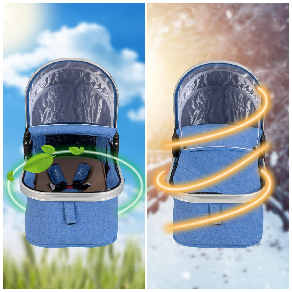 CONSTRUÇÃO DURÁVEL Este carrinho foi projetado com uma estrutura de alumínio leve e resistente e uma capa de linho respirável e não tóxica para proteger seu bebê de chuva e raios UV prejudiciais. O carrinho é sólido e estável, garantindo a segurança do seu bebê em qualquer terreno.