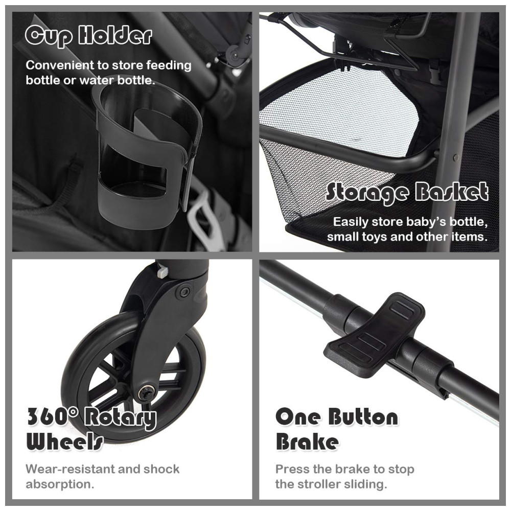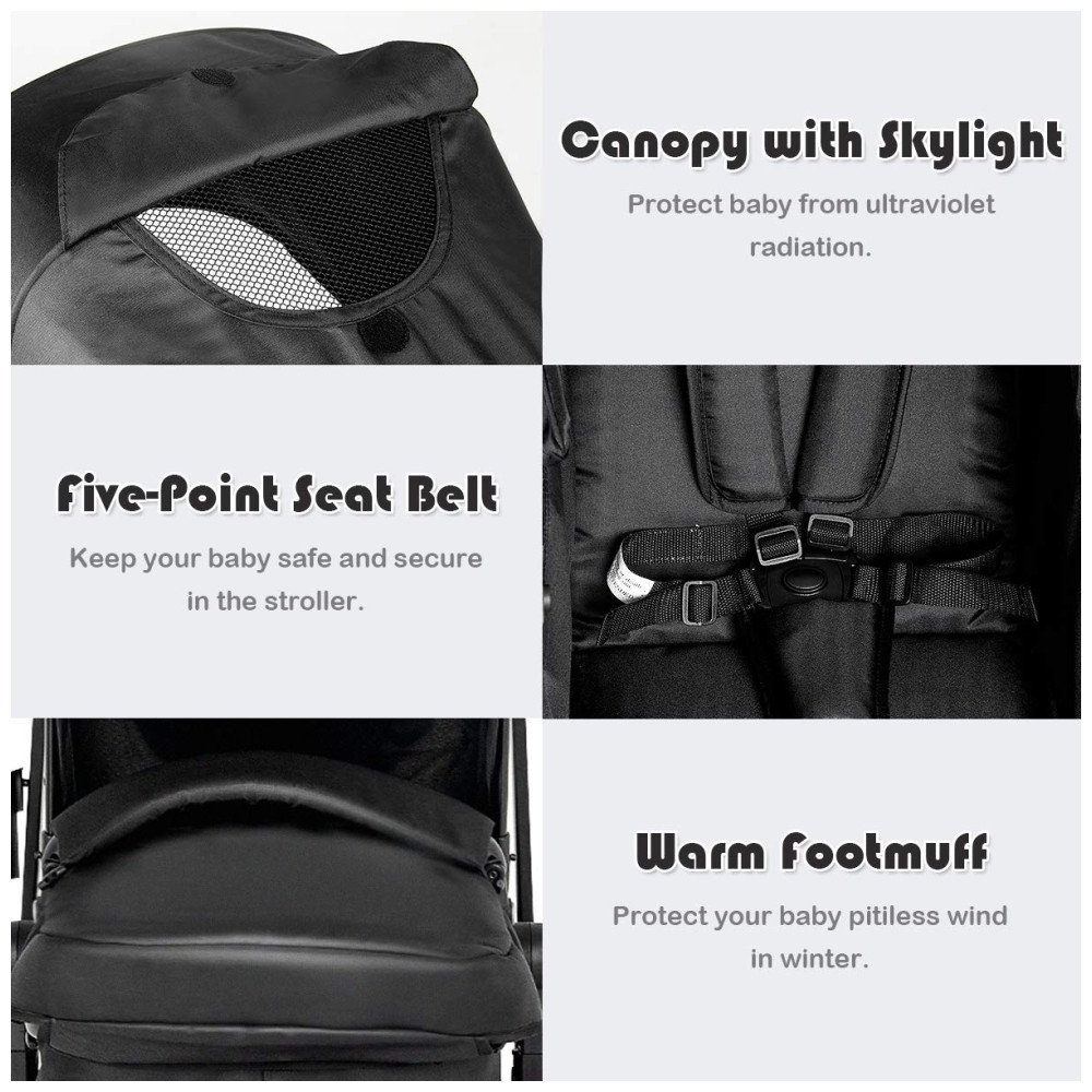 CARRINHO DE PASSEI Equipado com uma capa para os pés, pode proteger seu bebê do vento no inverno. Além disso, quando chegar o verão, você pode remover a capa para manter seu bebê fresco. Com uma estrutura de alumínio durável e leve e uma capa Oxford vestível e respirável, este carrinho oferece solidez e estabilidade para o seu bebê.