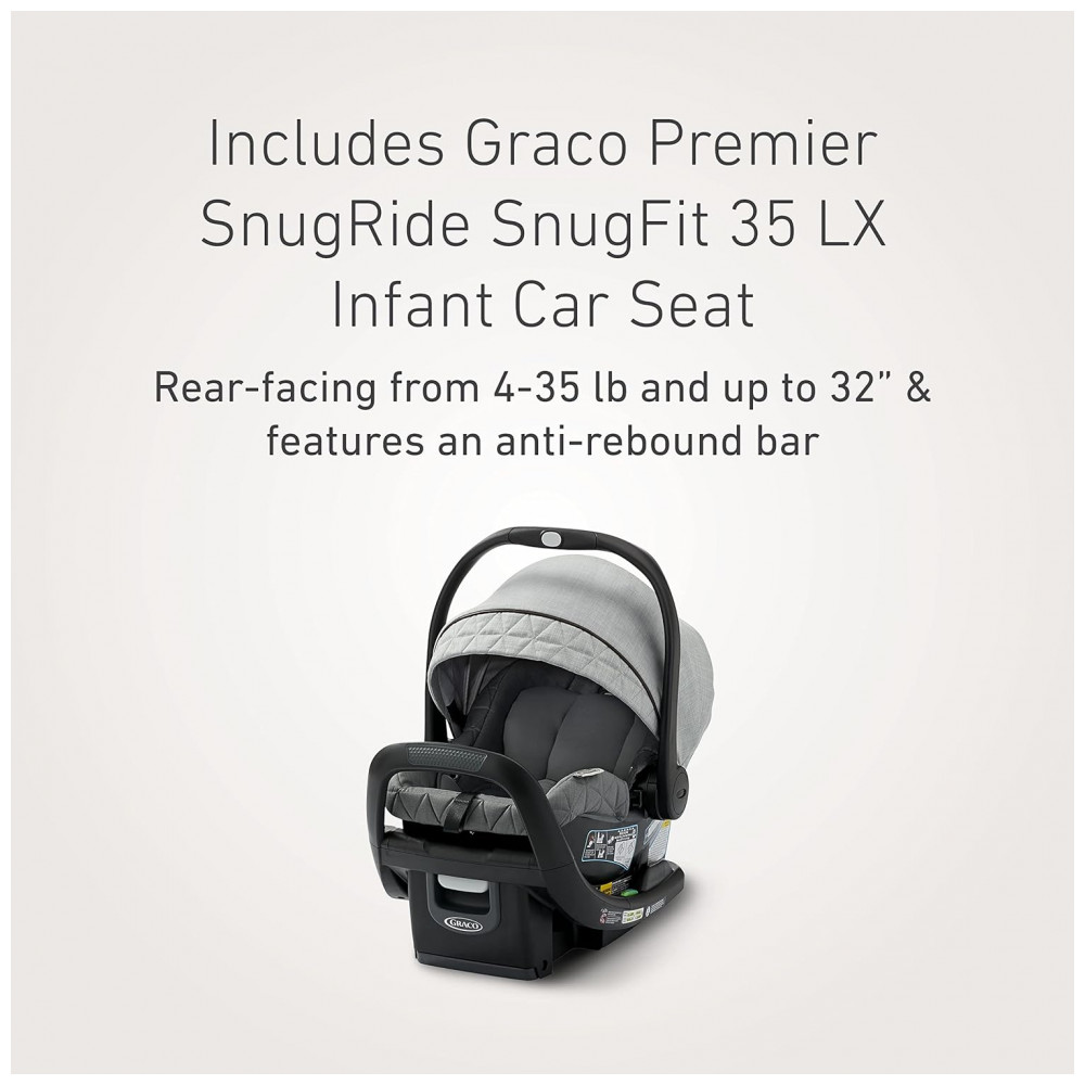 Inclui o assento de carro infantil Graco Premier SnugRide SnugFit 35 LX, voltado para a retaguarda para bebês de 2 a 15 kg e até para uma transição fácil de carro para carrinho