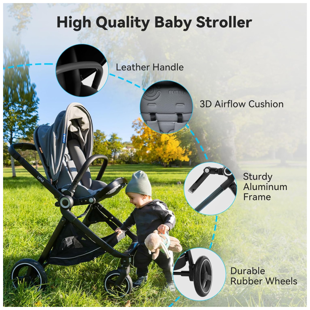 Construção robusta e segura A patente exclusiva de ajuste automático do centro de gravidade permite que o carrinho de bebê seja mais favorável quando o encosto é ajustado, permitindo que seu bebê mude com segurança do modo sentado para o modo de suspensão. O ELITTLE EMU foi certificado JPMA e atende aos padrões de segurança ASTM para garantir que o carrinho atenda aos mais altos padrões de segurança. A trava de segurança de cinco pontos do carrinho de berço pode proteger a segurança de o bebê durante todo o processo.