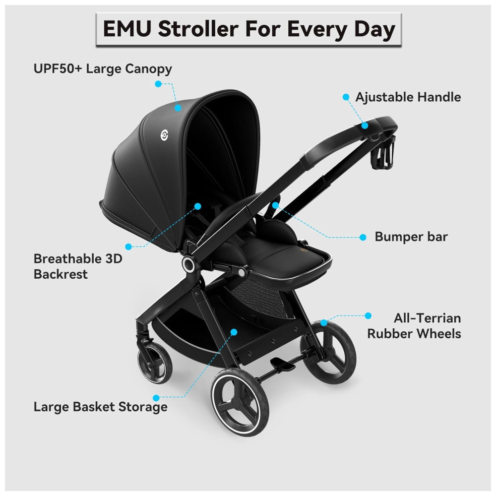O carrinho de passeio confortável EMU possui vários tipos diferentes de tecidos s para carrinhos de bebê, incluindo algodão, poliéster e lona. O algodão é macio e respirável é para revestimentos de carrinho e amortecimento. O poliéster é para a camada externa do tecido azul do carrinho de bebê EMU, pois é forte e durável e pode ser facilmente limpo. O Canvas é um tecido de algodão pesado e durável para a camada externa do tecido de carrinho preto , cinza da UEM.