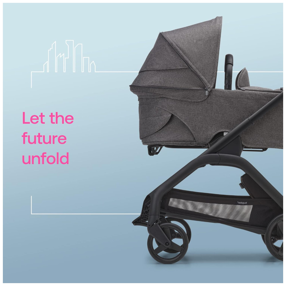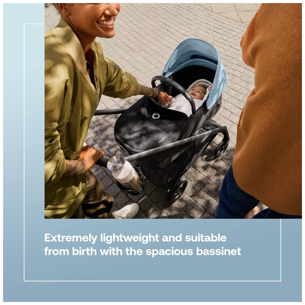 Feito com materiais de base biológica para reduzir as emissões de CO2, o carrinho é facilmente personalizável e compatível com a maioria dos acessórios para bebês Bugaboo, como porta copos, prancha com rodas, assentos de carro e muito mais.