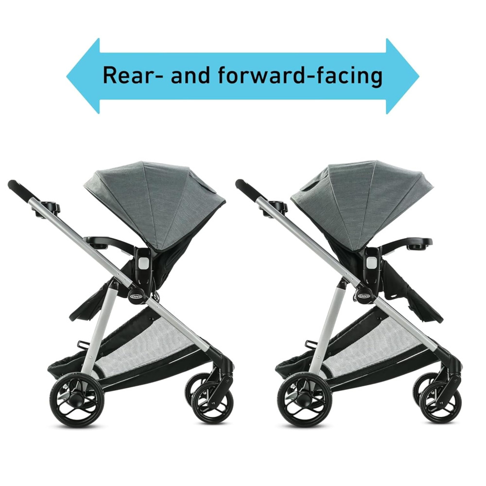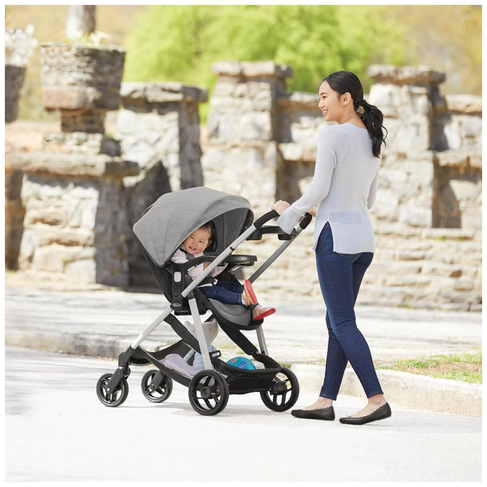 O assento reversível do carrinho pode ficar de frente para a mãe ou para o mundo, para o passeio certo à medida que o bebê cresce.