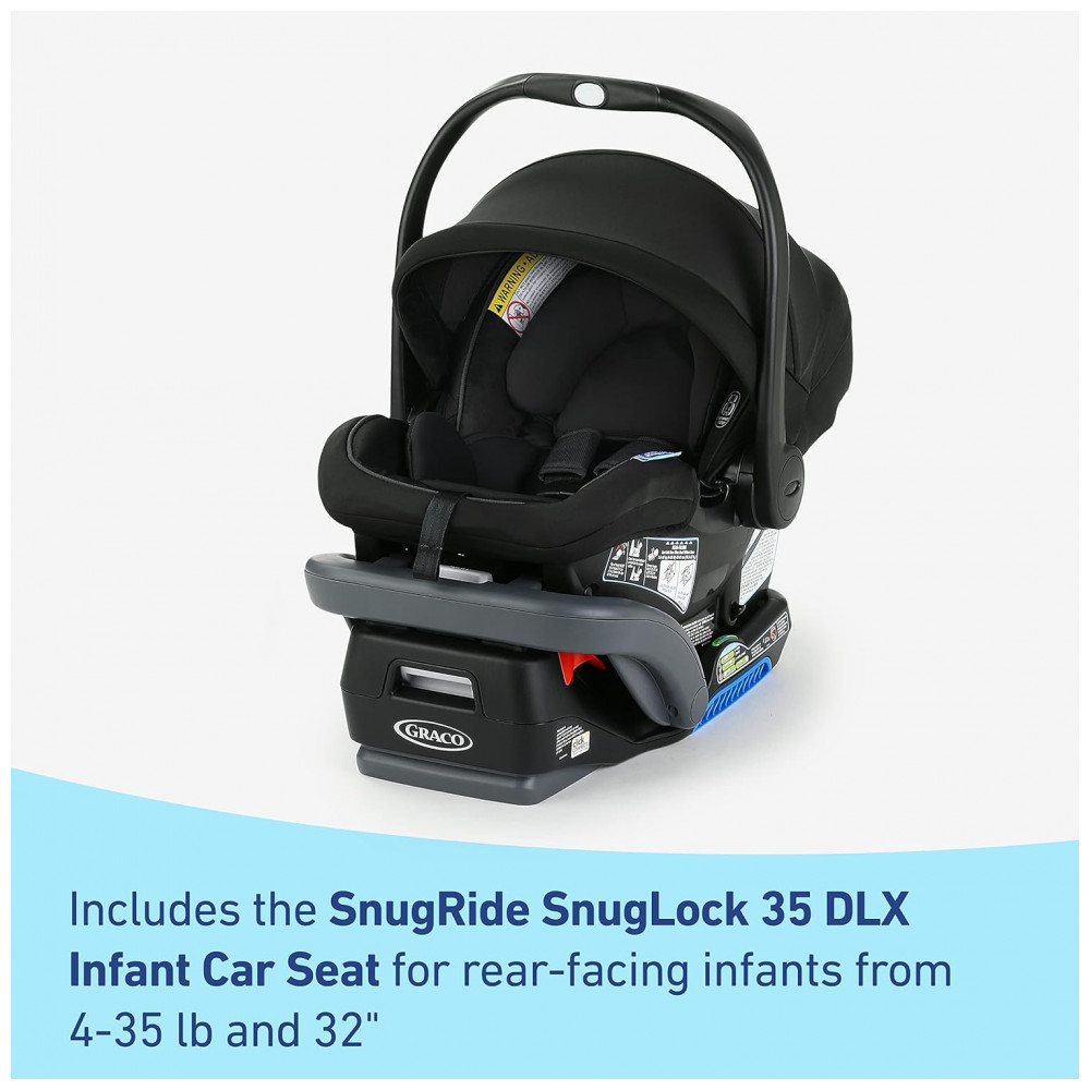 Inclui o assento de carro infantil Graco SnugRide SnugLock 35 DLX, voltado para trás para bebês de 2 a 15 kg até para uma transição fácil do carro para o carrinho