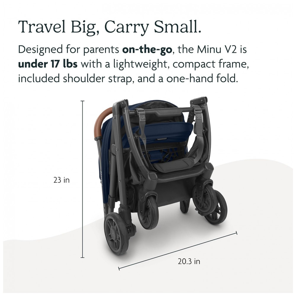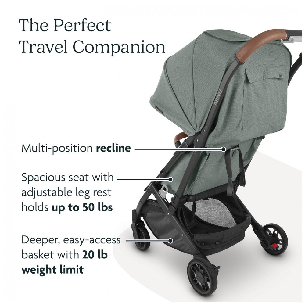 O carrinho MINU dobra com uma mão e um único movimento, permitindo que você segure o bebê em um braço enquanto dobra o carrinho com a outra mão. Possui suspensão nas quatro rodas com absorção de choque, proporcionando um passeio suave para você e seu bebê. O assento espaçoso do MINU suporta até 22,68 kg e possui reclinação em várias posições e descanso de perna ajustável com uma mão, permitindo que seu filho descanse ou aprecie a vista. Além disso, o carrinho tem um cesto grande e de fácil acesso para guardar itens essenciais e outros objetos que você possa precisar