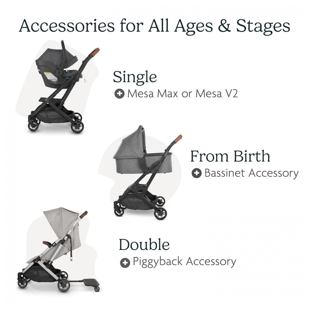 Assento espaçoso adequado para crianças de 3 meses até 22,68 kg, dobra compacta com uma mão e uma etapa. Adequado desde o nascimento com acessório de berço ou assento de carro infantil com uso de adaptadores não incluídos. Cesta mais profunda e de fácil acesso com limite de peso de 9,07 kg. Dossel extensível com zíper para maior proteção solar e descanso de perna ajustável com uma mão. Barra de para choque 100 couro integral incluída.