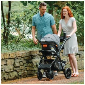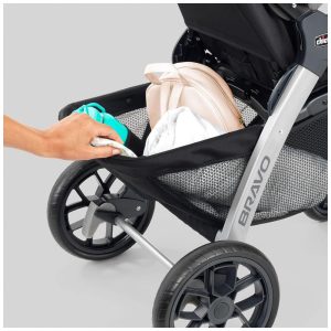 Cobertura UPF 50 com viseira de puxar e janela de malha peek a boo, rodas grandes com pneus com piso e uma grande cesta de zenamento com acesso frontal e traseiro e 2 bolsos do organizador.
