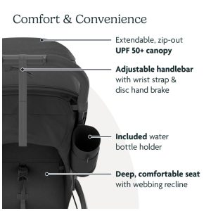 O carrinho suporta até 9,07 quilos no cesto de armazenamento coberto com bolsos embutidos e suporte para garrafa adicional. Além disso, possui um assento acolchoado profundo com bolsos laterais para armazenamento de itens pequenos e alça de pulso incluída para segurança durante a corrida. O tecido é repelente à água e possui detalhes refletivos na estrutura e na cesta para fornecer maior visibilidade. O conjunto de carro infantil é compatível com adaptadores vendidos separadamente.