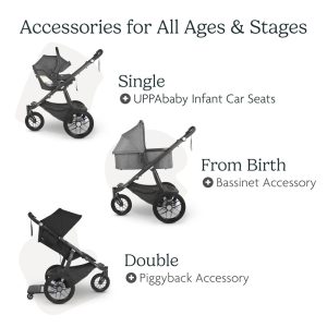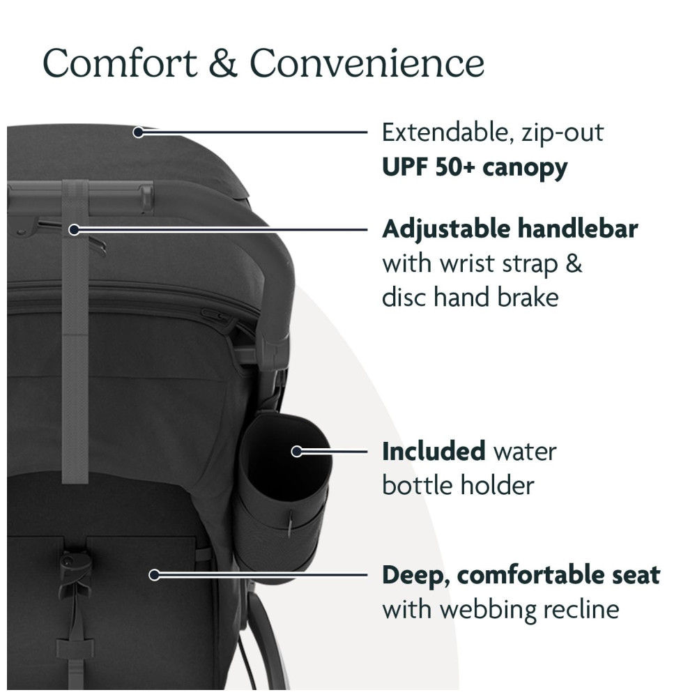 A roda dianteira é giratória com trava e o rastreador ajustável permite o ajuste fino do alinhamento das rodas. O carrinho é dobrável com uma mão e fica em pé quando dobrado. Possui XL capota ajustável com zíper, guarda sol UPF 50 e bolso com zíper na capota para armazenamento do telefone. O assento acolchoado de 5 pontos é reclinável em rede com janela de visualização de malha e aba de cobertura.