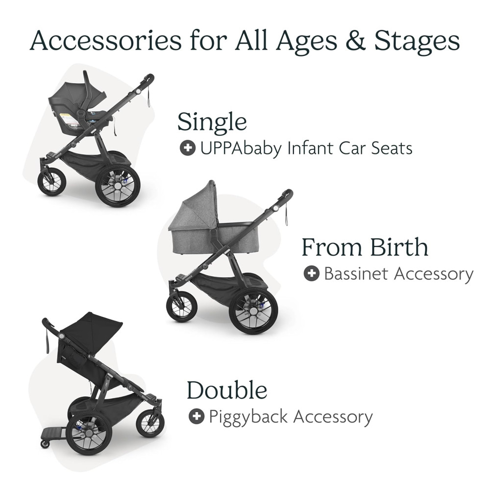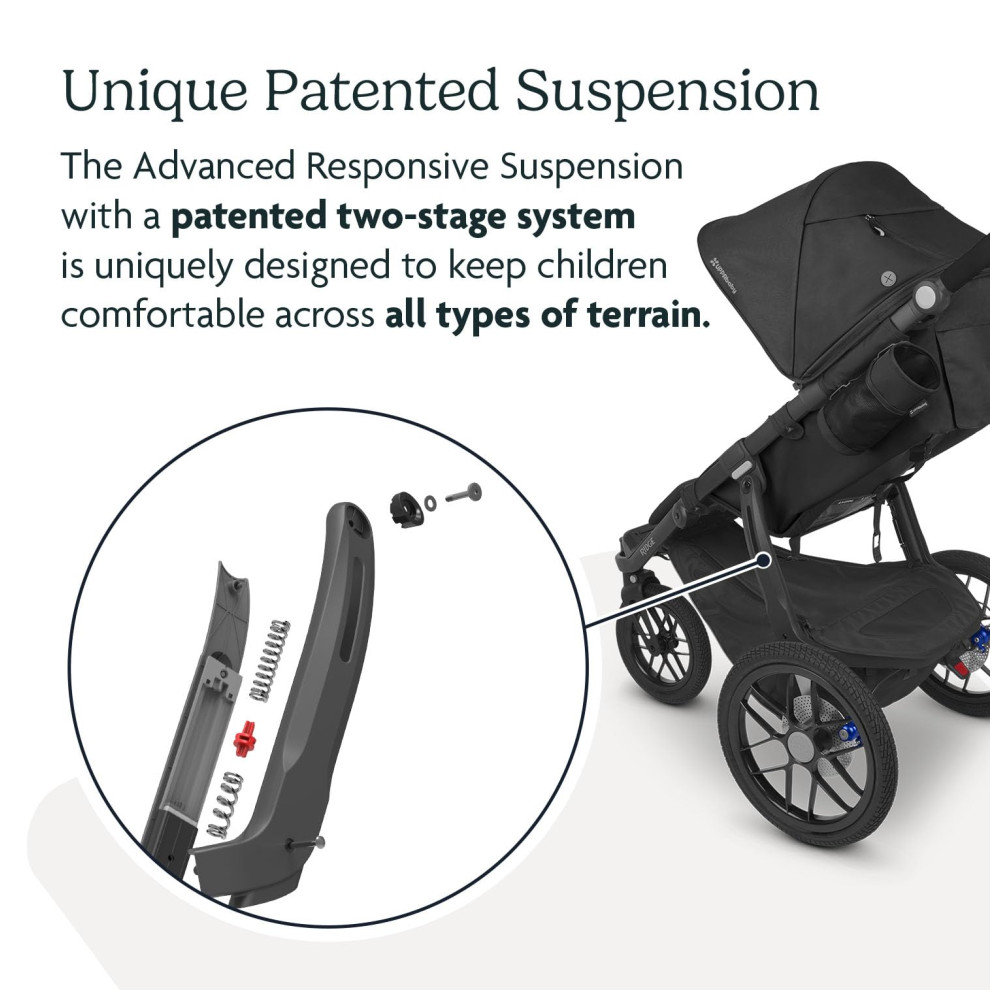 O carrinho de corrida UPPAbaby RIDGE AllTerrain é ideal para quem gosta de atividades ao ar livre. Com uma suspensão avançada de dois estágios, o passeio é confortável em qualquer terreno, independentemente do peso da criança. Os pneus de espuma EVA 12×16 eliminam a necessidade de bomba de ar e o sistema de freio de mão a disco proporciona capacidade de resposta avançada em descidas ou superfícies irregulares.