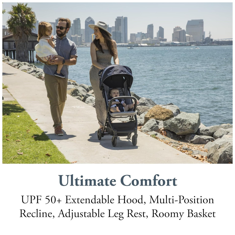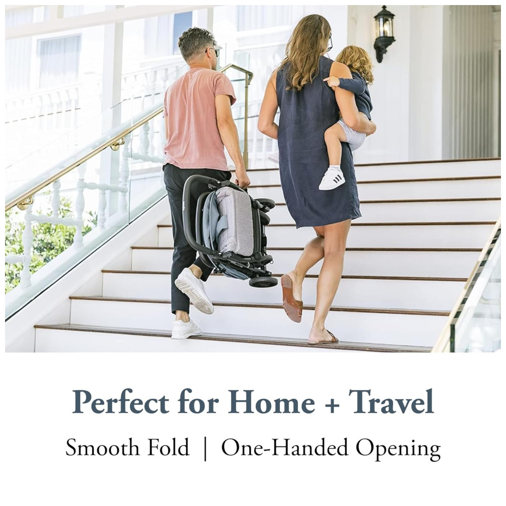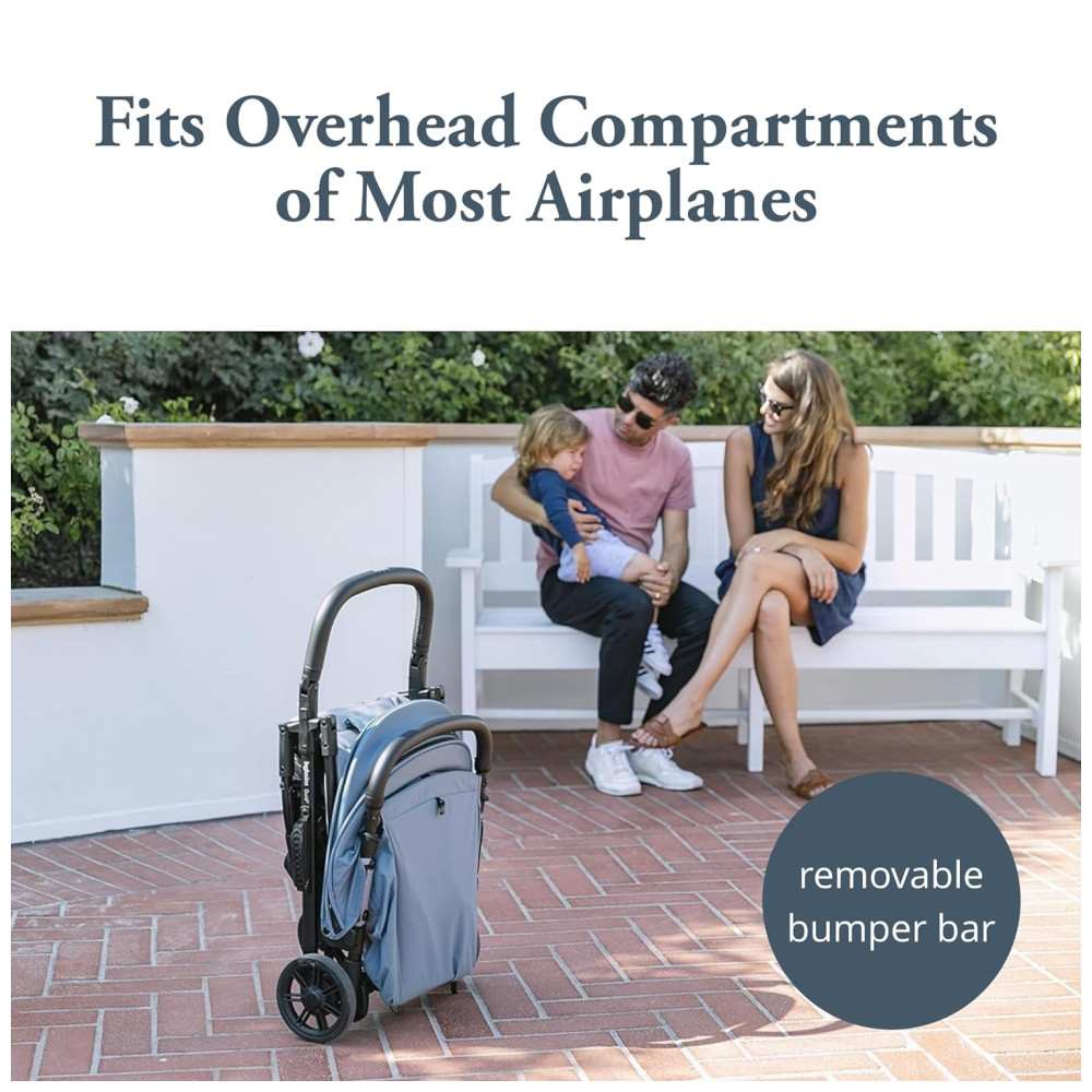 A barra do para choque dianteiro pode ser facilmente removida ou aberta, permitindo que seu filho se acomode facilmente no lugar. Este carrinho de viagem perfeito facilita o transporte graças à sua alça lateral.