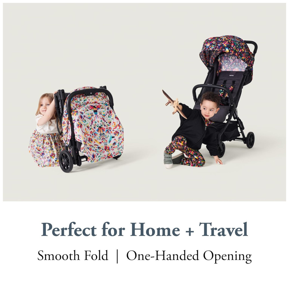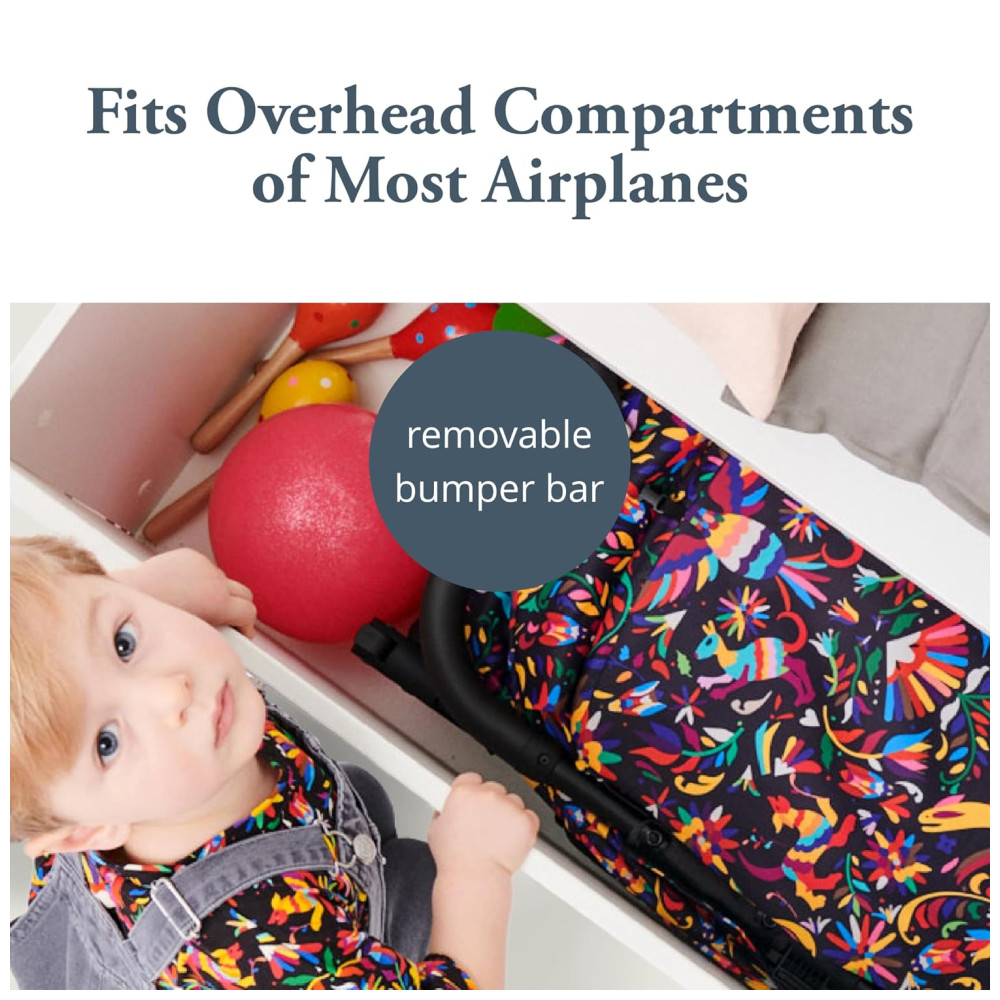 A barra do para choque dianteiro pode ser facilmente removida ou aberta, permitindo que seu filho se acomode facilmente no lugar. Este carrinho de viagem perfeito facilita o transporte graças à sua alça lateral.