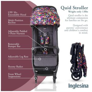 O carrinho possui uma cesta de armazenamento espaçosa e é equipado com um arnês de segurança de 5 pontos e material reflexivo para maior segurança e melhorar a visibilidade à noite. O Quid é compacto, fácil de abrir e dobrar, e possui uma alça de transporte conveniente. Como todos os produtos Inglesina, não contém BPA, chumbo e ftalatos.