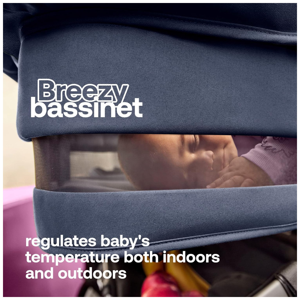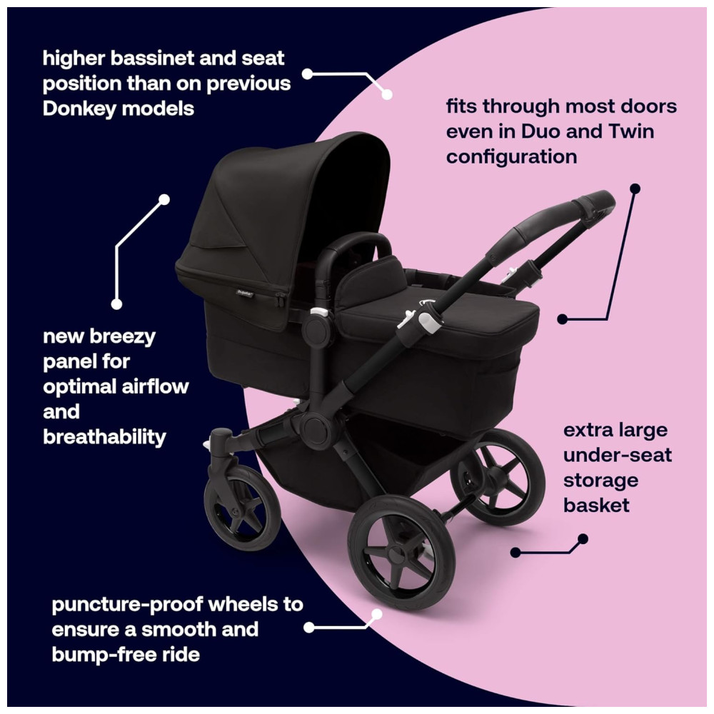 O Donkey 5 Mono pode acomodar uma única criança desde o nascimento e se transforma em um carrinho lado a lado para atender às necessidades de sua família em crescimento, com o Duo Extension Set vendido separadamente ou Twin Duo Extension Set e Twin Bassinet. O berço possui um design elegante com novo sistema de ventilação que mantém seu bebê confortável e regulará sua temperatura. A malha transparente e macia permite que seu bebê descubra o mundo ou seus irmãos nos modos Duo e Twin.
