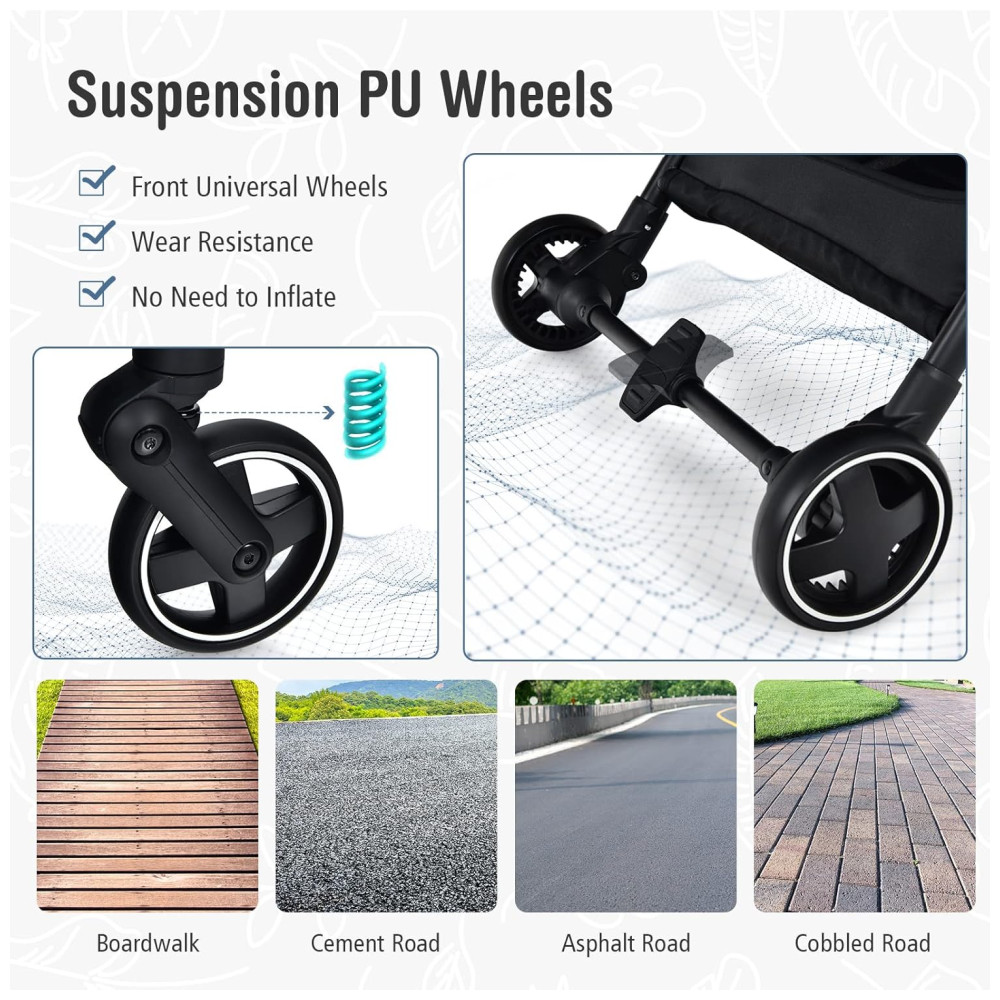 Este carrinho de passeio infantil é feito de couro PU de poliéster e alumínio, e tem um assento giratório de 360 graus com duas opções de uso faceinside para observar o bebê ou virado para fora para que ele possa desfrutar do mundo exterior. Possui uma janela peekaboo com ímã para interação. A estrutura de alumínio resistente torna o à prova de ferrugem para uso externo prolongado, além de ser leve e dobrável com uma mão para maior conveniência em viagens ou armazenamento.