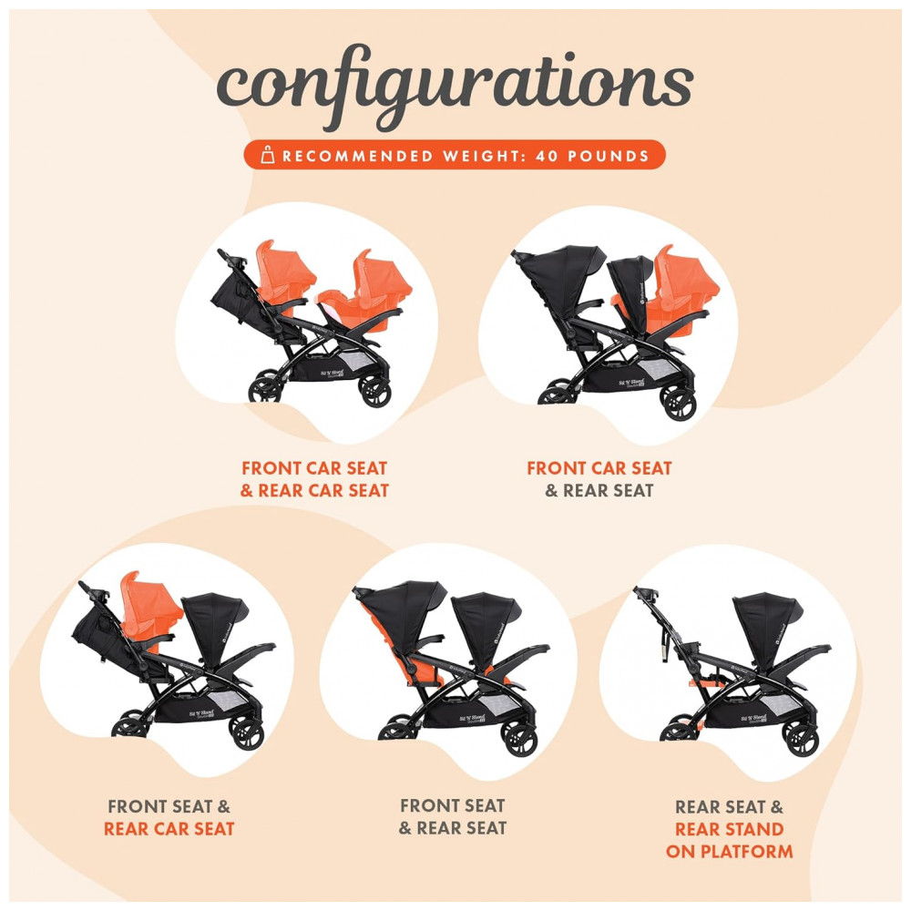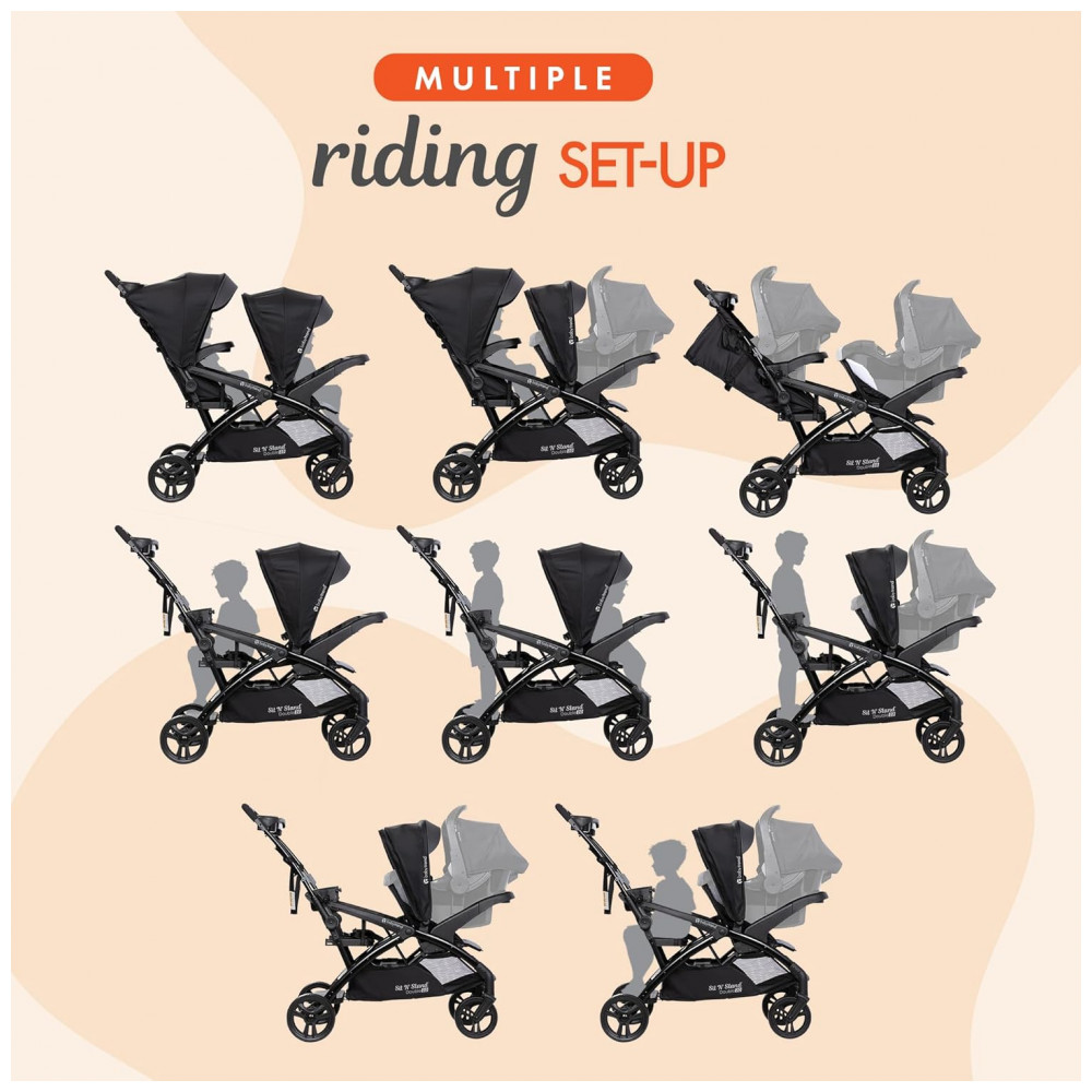 As crianças podem sentar se nos bancos dianteiro e traseiro do carrinho ou ficar na plataforma traseira Assentos de carro compatíveis com tendência para bebês Cor tempestuoso