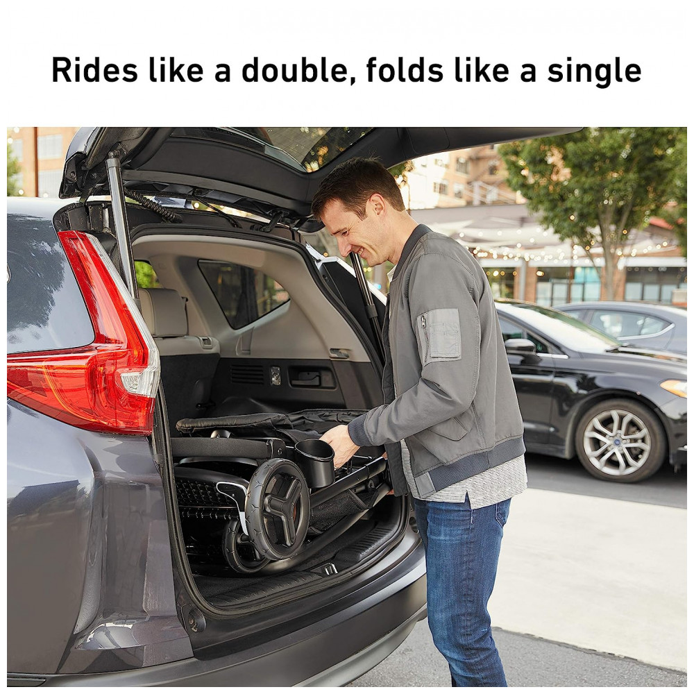 Carrinho dobrável pequeno anda como um duplo, mas dobra como um único carrinho, facilitando o transporte e o zenamento