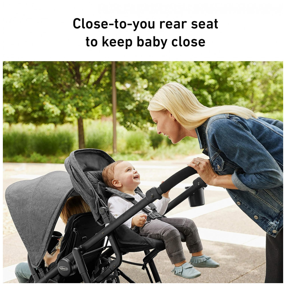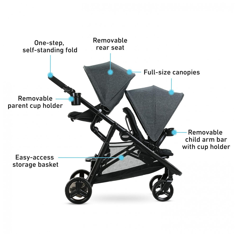 Conheça o Graco Ready2Grow 2.0 Double Stroller, agora com um visual e recursos atualizados. O Ready2Grow 2.0 anda como um carrinho duplo, mas se dobra como um único, facilitando o transporte e o zenamento. O Ready2Grow 2.0 inclui duas posições de assento, que podem acomodar dois assentos infantis Graco ao mesmo tempo, tornando o um ótimo carrinho para gêmeos e irmãos de idade próxima. Além disso, remova o banco traseiro e converta o facilmente em um banco ou uma plataforma de pé para o seu filho mais velho andar. O assento traseiro próximo a você oferece uma conexão mais próxima com o bebê, enquanto o assento inferior tem a altura certa para facilitar a entrada e saída do bebê. Uma cesta de zenamento grande e de fácil acesso tem espaço para os itens essenciais do bebê e dos pais. O porta copos dos pais e a barra de barriga da criança com porta copos são removíveis para sua conveniência.