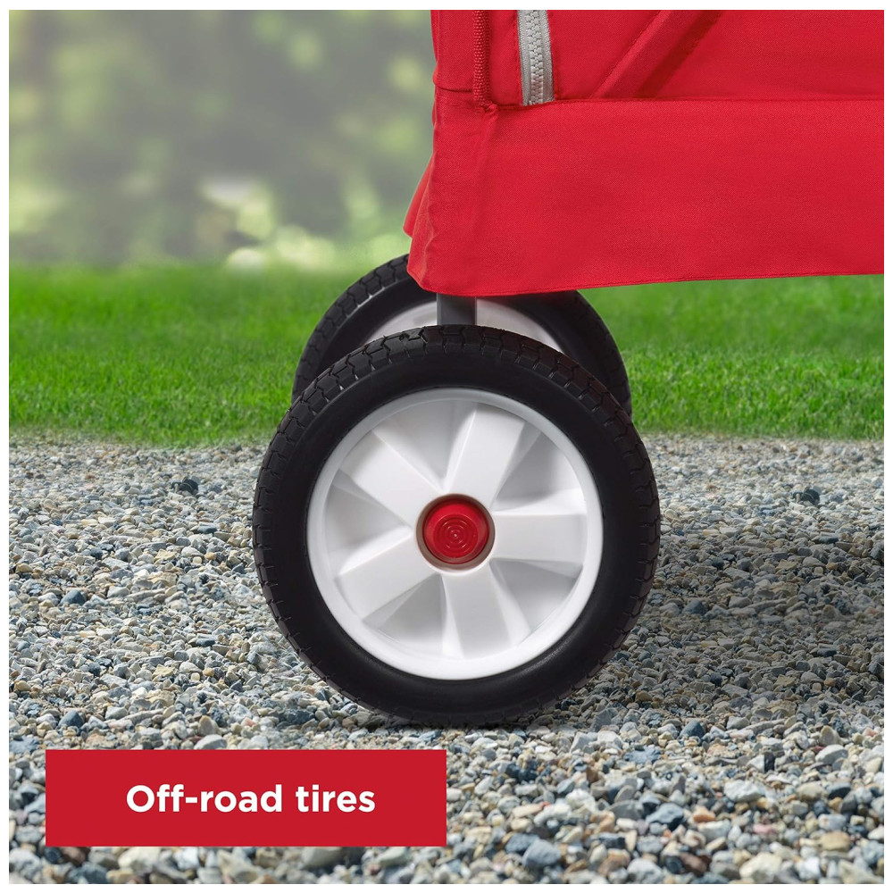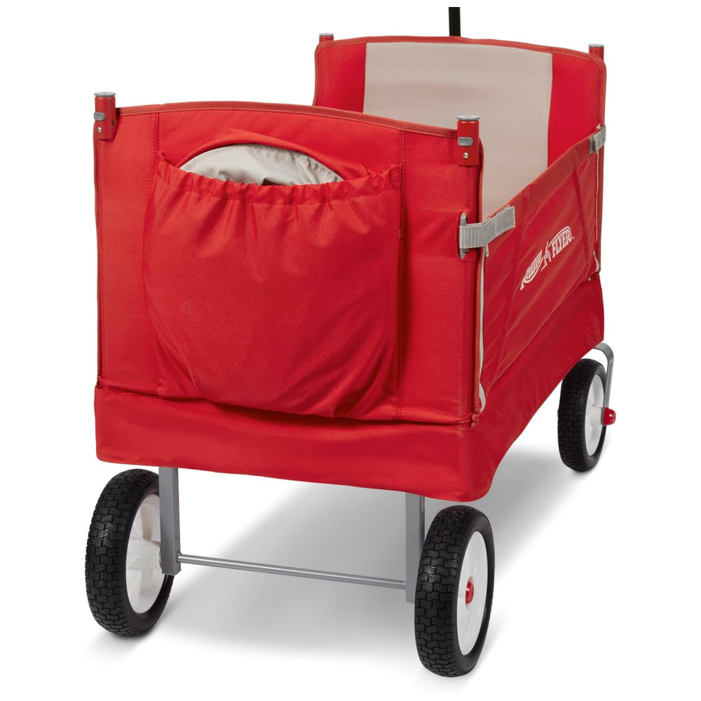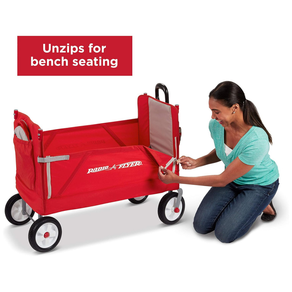 PARA CRIANÇAS Os vagões Radio Flyer atendem ao padrão de segurança de brinquedos ASTM F963 13. Este vagão inclui cintos de segurança e um dossel de proteção UV para proteger os seus pequeninos do sol.