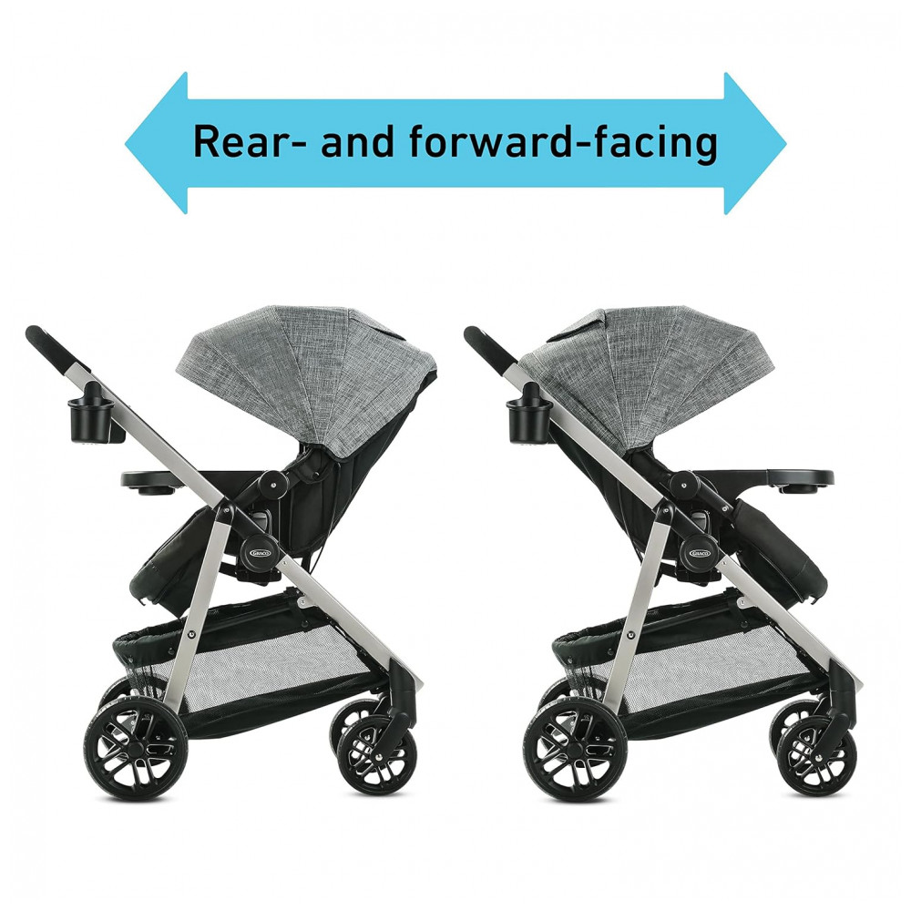 O assento reversível do carrinho pode ficar de frente para a mãe ou para o mundo, para o passeio certo à medida que o bebê cresce.