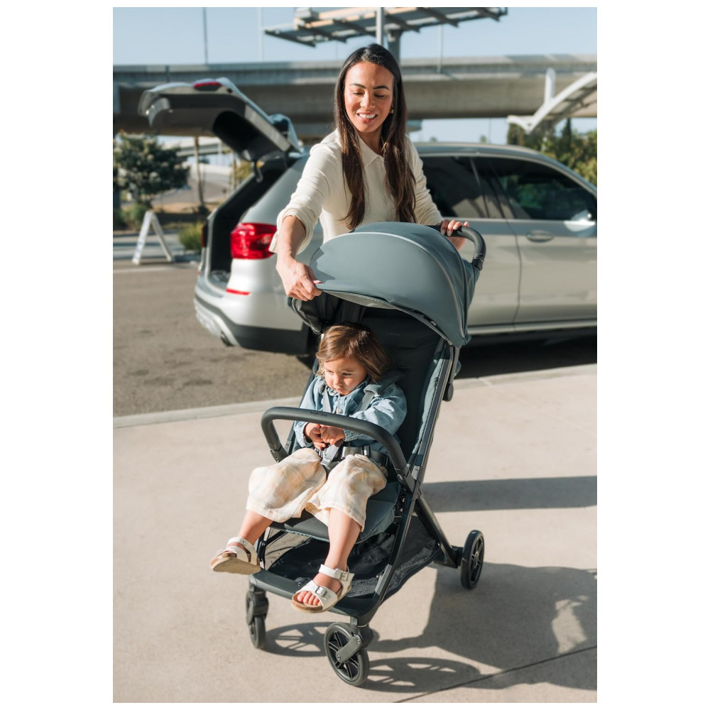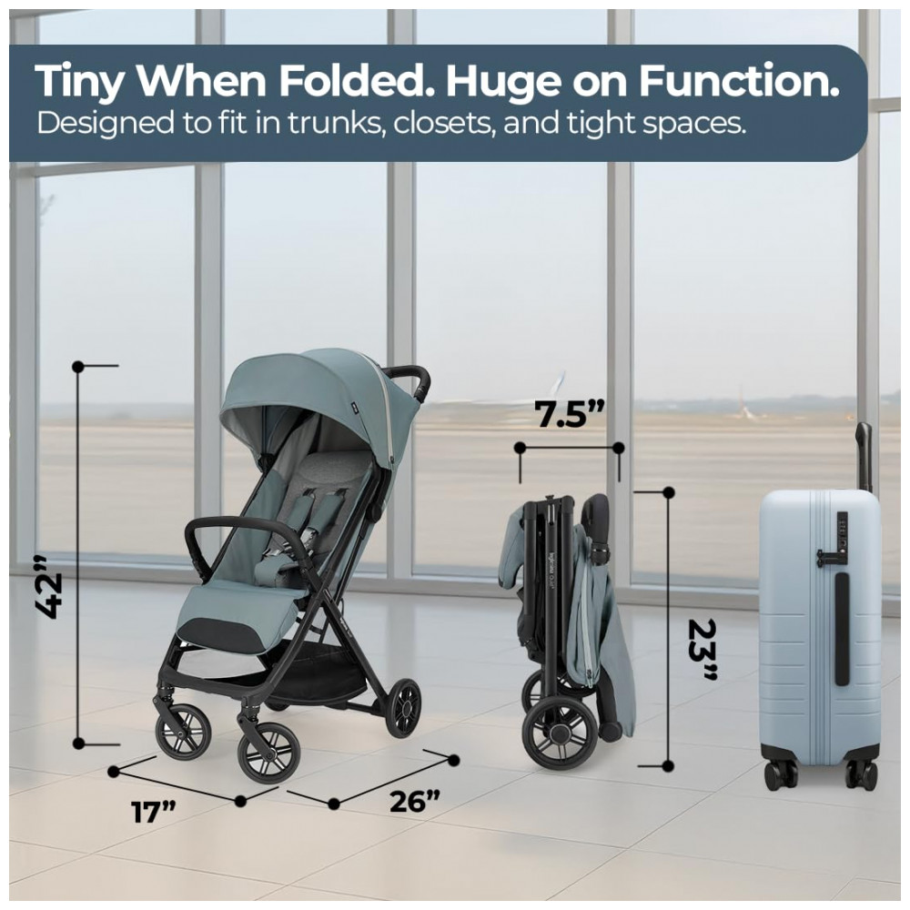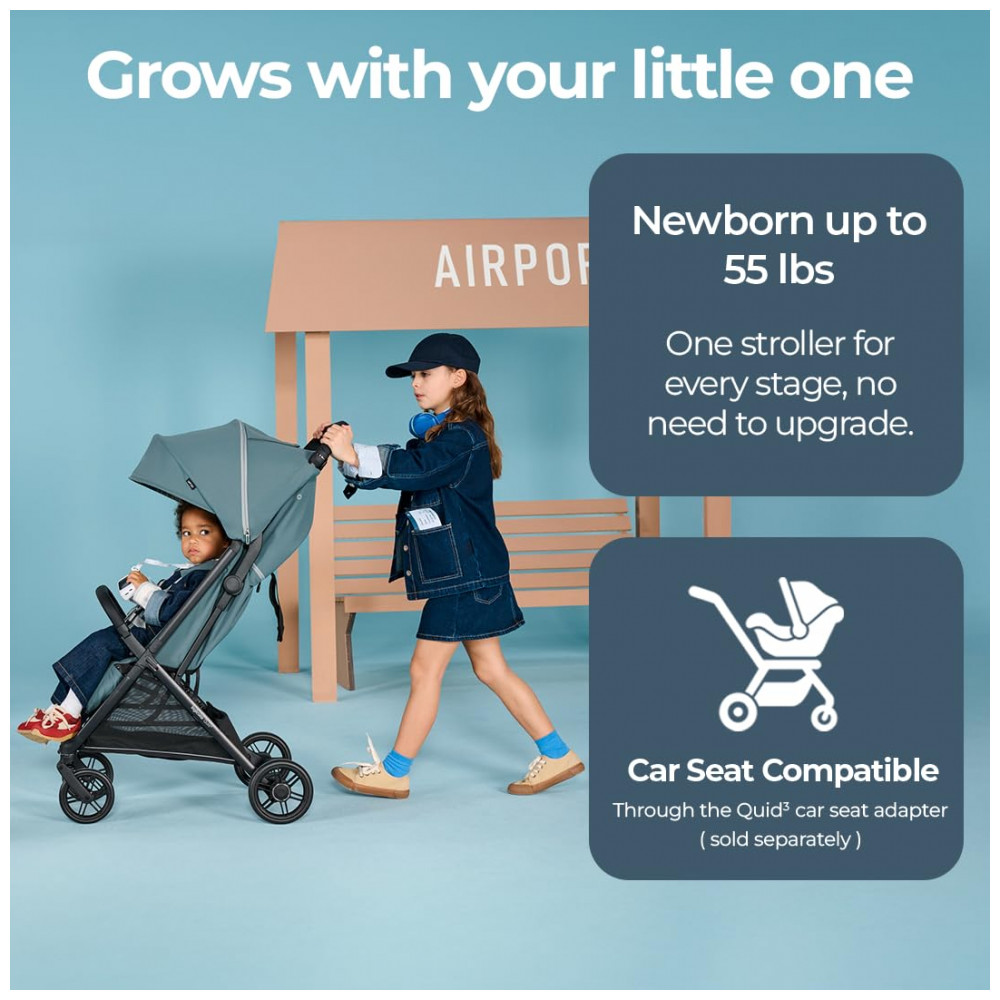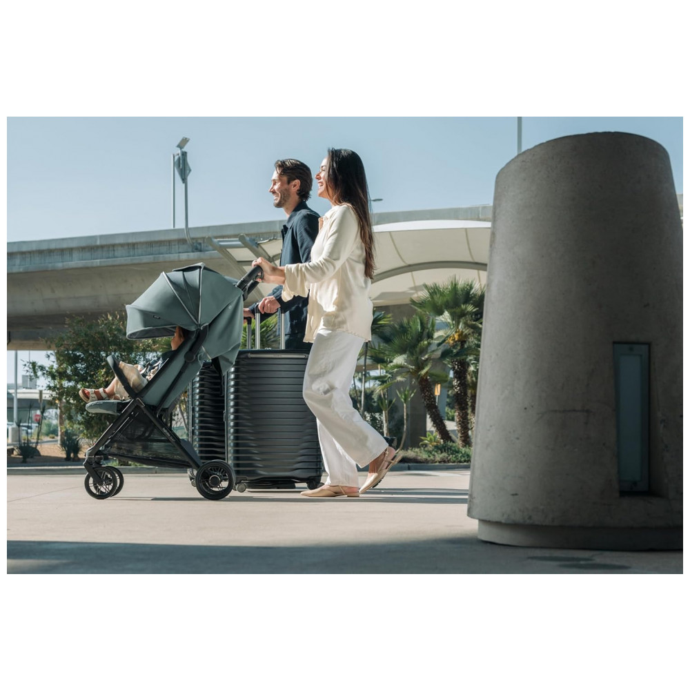 O sistema de dobragem com uma mão permite fechamento prático e rápido, com suporte que mantém o carrinho em pé quando fechado, mantendo a limpeza da estrutura e do bebê. Compatível com assentos de bebê das marcas Nuna, Maxi-Cosi, Cybex e Clek por meio de adaptador (vendido separadamente), pode ser usado desde o nascimento até crianças com peso de 25 kg.