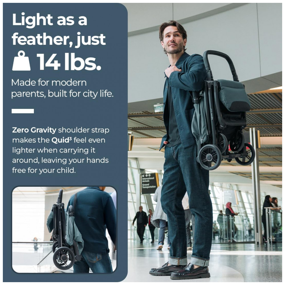 O carrinho Inglesina Quid³ é um modelo ultraleve e compacto, pesando aproximadamente 6,3 kg, projetado para facilitar a mobilidade e o armazenamento em compartimentos superiores de aviões. Equipado com estrutura de alumínio resistente e revestimento em poliéster, combina durabilidade com conforto para o bebê.