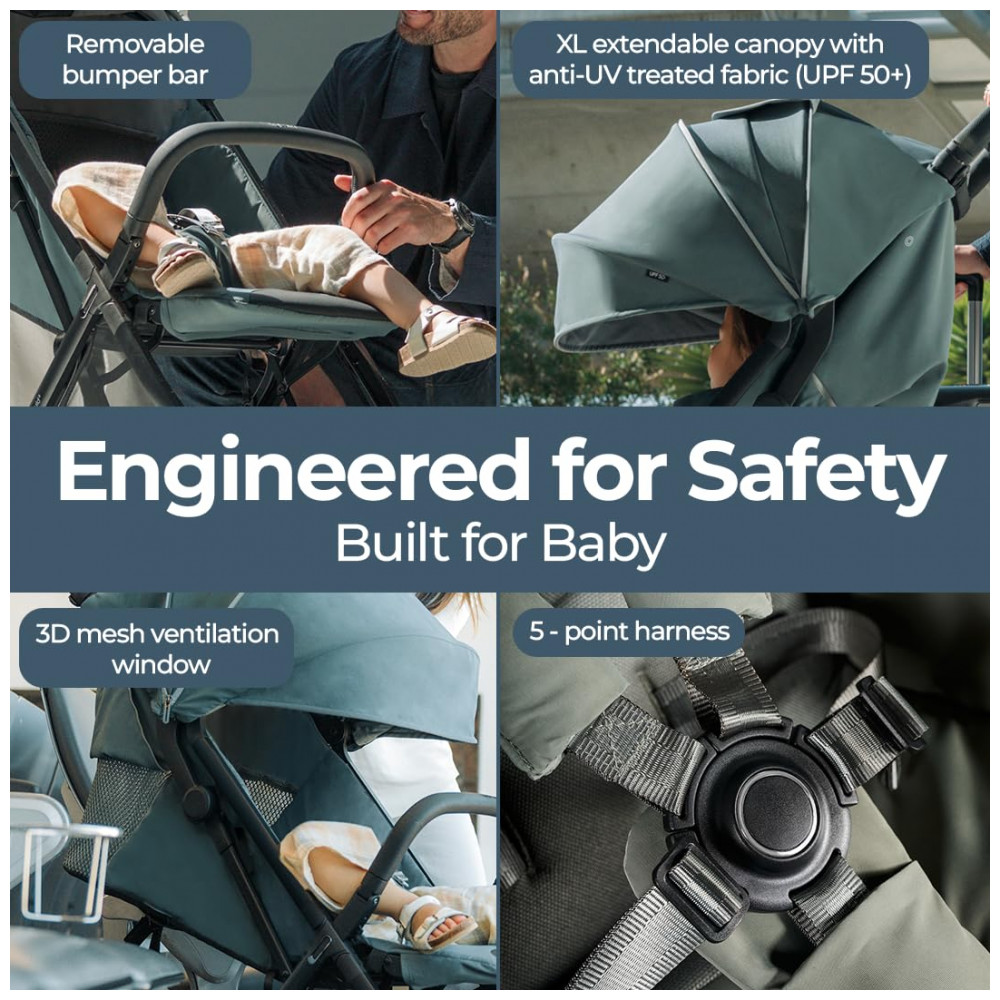 Conta com cinto de segurança de 5 pontos, barra frontal removível e capota extensível com proteção solar UPF 50+. O assento possui tecido em jersey macio e acolchoado, com janela de ventilação em malha 3D magnética para circulação do ar e conforto térmico.