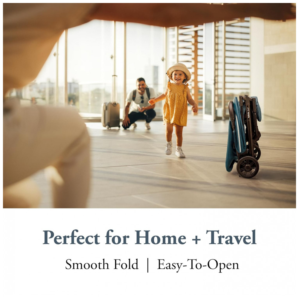 A capota é confeccionada com tecido tratado para proteção UV (UPF 50+), possui ventilação retrátil para circulação de ar e oferece visibilidade graças ao tecido refletivo na cesta inferior. O carrinho apresenta sistema de suspensão nas rodas para amortecimento em diferentes tipos de terreno, rodas dianteiras giratórias com trava para estabilidade e frenagem eficiente nas rodas traseiras. O cinto de segurança é do tipo 5 pontos ajustável, garantindo segurança durante o uso. Todos os materiais são livres de BPA, chumbo e ftalatos, conforme normas internacionais para proteção infantil.