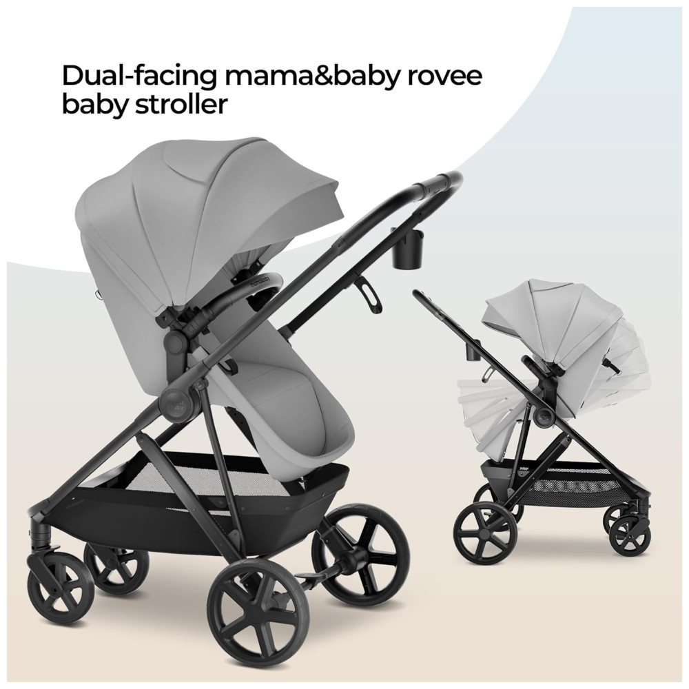 Carrinho de Bebê MAMA BABY Rovee Bassinet 2 em 1 Assento Reversível Capota com Proteção Solar UPF 50 e Rodas Todo-Terreno para Famílias Ativas