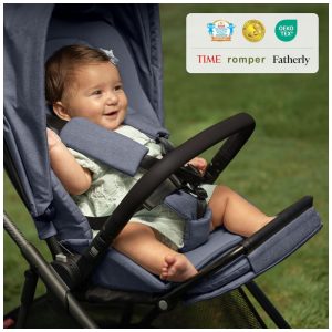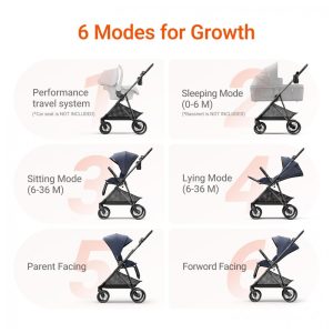 As rodas fabricadas em poliuretano (PU) são adequadas para diversos tipos de terreno, oferecendo estabilidade e conforto. A capota em poliéster garante proteção contra a radiação solar, enquanto a cesta inferior suporta armazenamento prático para itens essenciais.