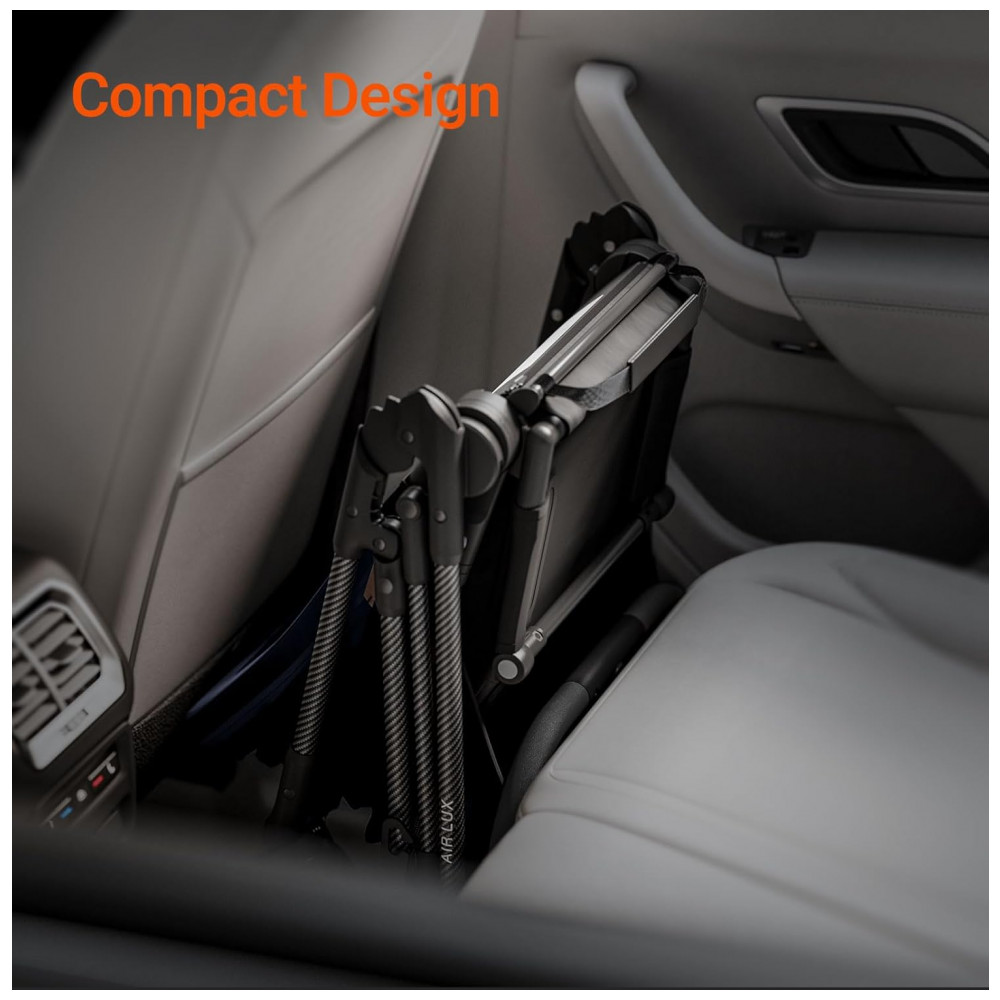 O carrinho MAMAZING Air Lux apresenta uma estrutura robusta em fibra de carbono combinando leveza e resistência, com peso aproximado de 7,2 kg, garantindo facilidade de transporte para o dia a dia. Seu design compacto permite dobragem com uma mão, facilitando o armazenamento e o manuseio em ambientes urbanos e viagens.
