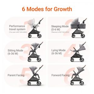 Projetado para desde recém-nascidos até crianças de até 16,8 kg, o carrinho é conversível em 6 modos diferentes, incluindo modo berço. Inclui adaptador para assento de carro infantil (assento não incluso). O encosto e o apoio para pernas são ajustáveis para maximizar o conforto do bebê, seja para descanso ou para momentos de atividade.