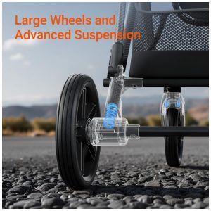O carrinho traz também freios de fácil acionamento, alça regulável para conforto do cuidador e rodas grandes com suspensão para passeio suave em terrenos irregulares. A cesta inferior suporta até 15 kg, possibilitando transporte de acessórios com praticidade.