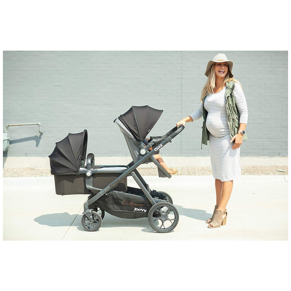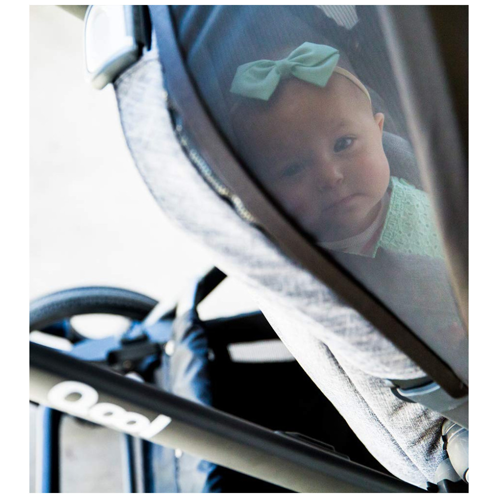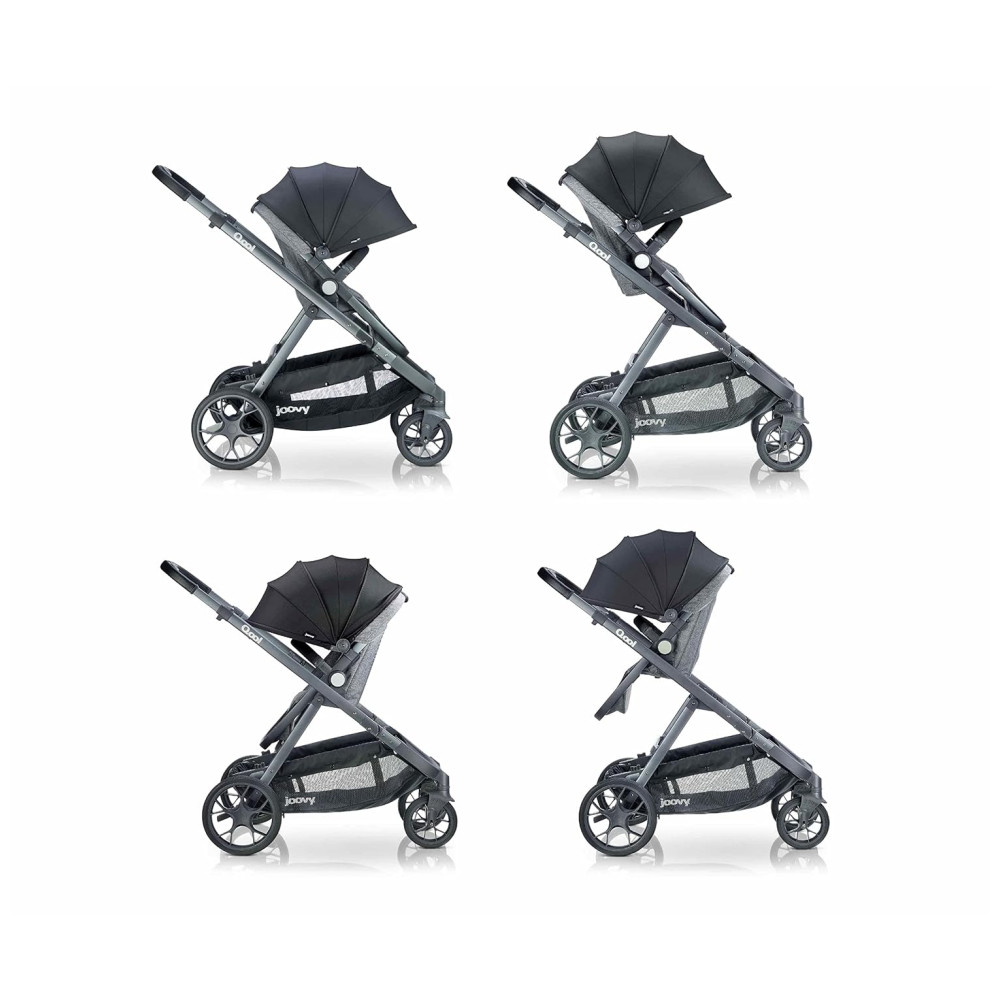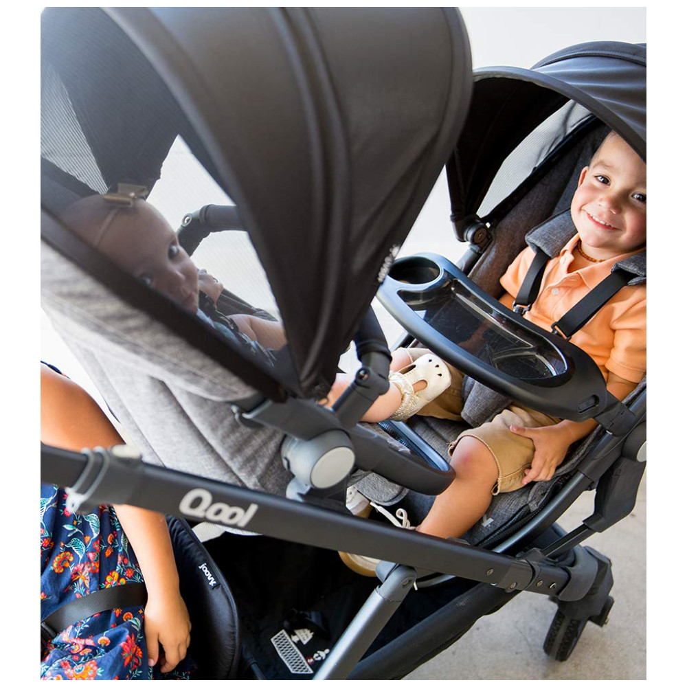 A bandeja de lanches swingopen com porta copos e organizador para os pais agora está incluída no carrinho joovy Qool. Cada assento pode suportar até 24,94 quilos e pode ser posicionado voltado para a frente ou para os pais em uma posição alta ou baixa na estrutura do carrinho. O dossel de proteção solar UPF 50 ajustável, a grande janela esconde esconde de malha, as rodas dianteiras giratórias e o assento reclinável multiposições são recursos adorados no Qool original.