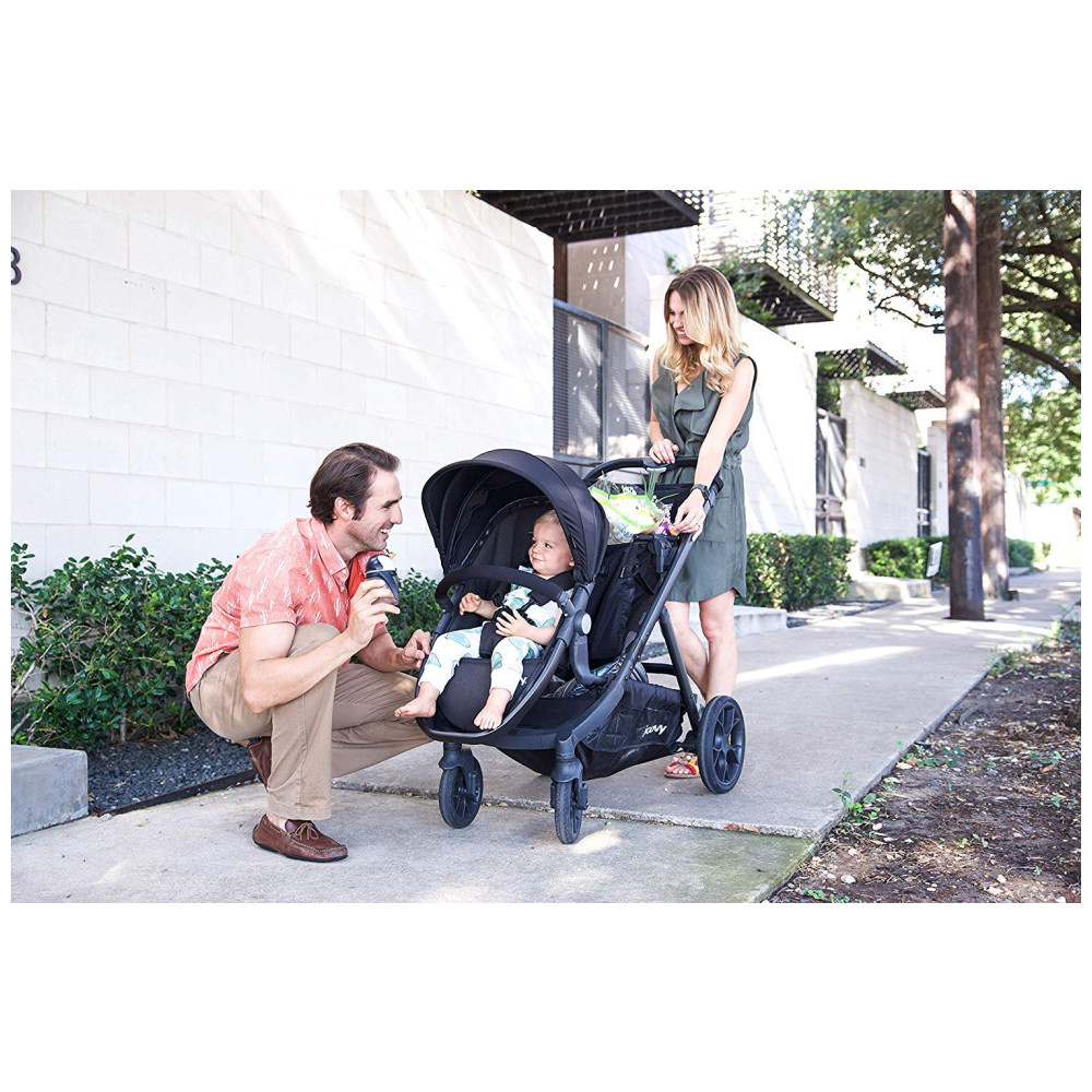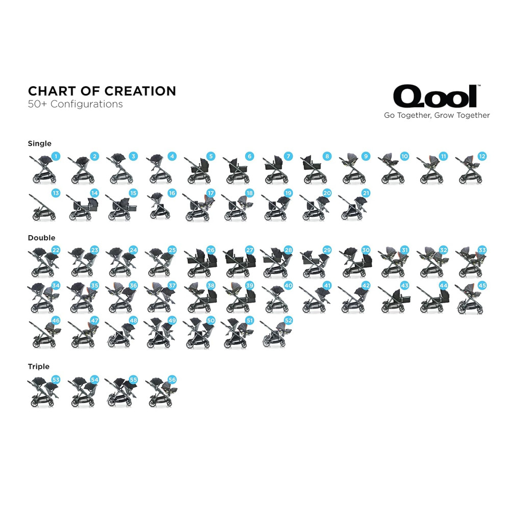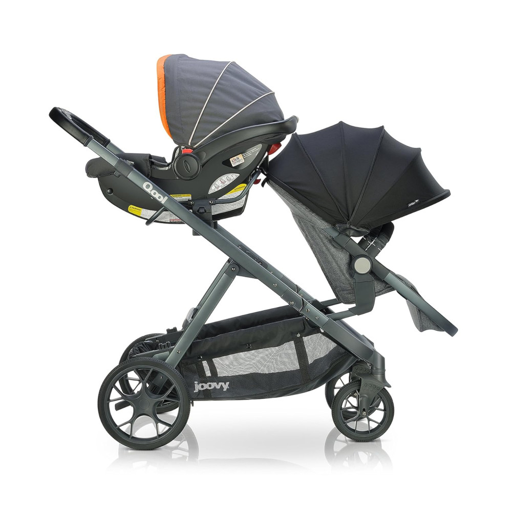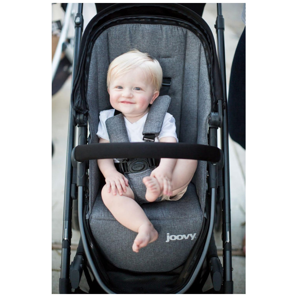 A bandeja de lanches swingopen com porta copos e organizador para os pais agora está incluída no carrinho joovy Qool. Cada assento pode suportar até 24,94 quilos e pode ser posicionado voltado para a frente ou para os pais em uma posição alta ou baixa na estrutura do carrinho. O dossel de proteção solar UPF 50 ajustável, a grande janela esconde esconde de malha, as rodas dianteiras giratórias e o assento reclinável multiposições são recursos adorados no Qool original.